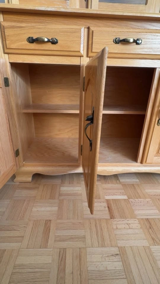 High-quality craftsmanship with a classic, timeless design that adds warmth to any dining space. Solid oak construction throughout. Upper hutch with glass doors and shelving for display. Lower buffet with drawers and cabinets for generous storage. Original hardware, sturdy and well maintained. 73” high (just over 6 ft), 61” long, 18” deep. Elegant, functional, and built to last.