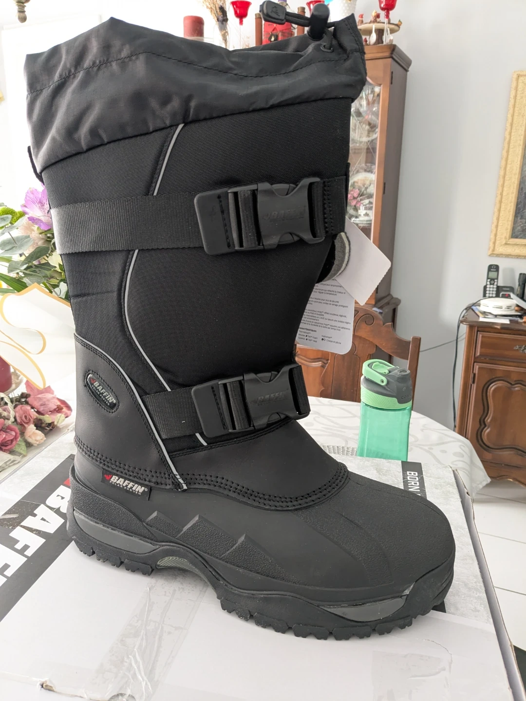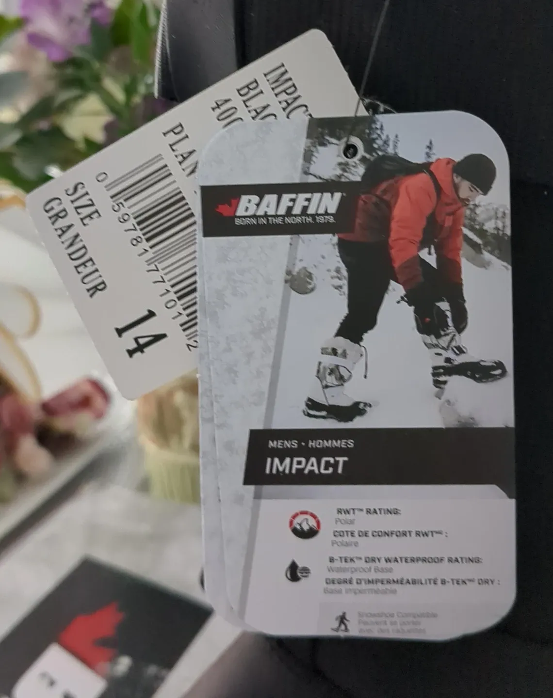 These Baffin Impact boots are designed for cold weather. They feature B-Tek Dry waterproof rating and a polar RWT rating. Includes adjustable straps and a drawstring closure for a secure fit. Great for winter activities!