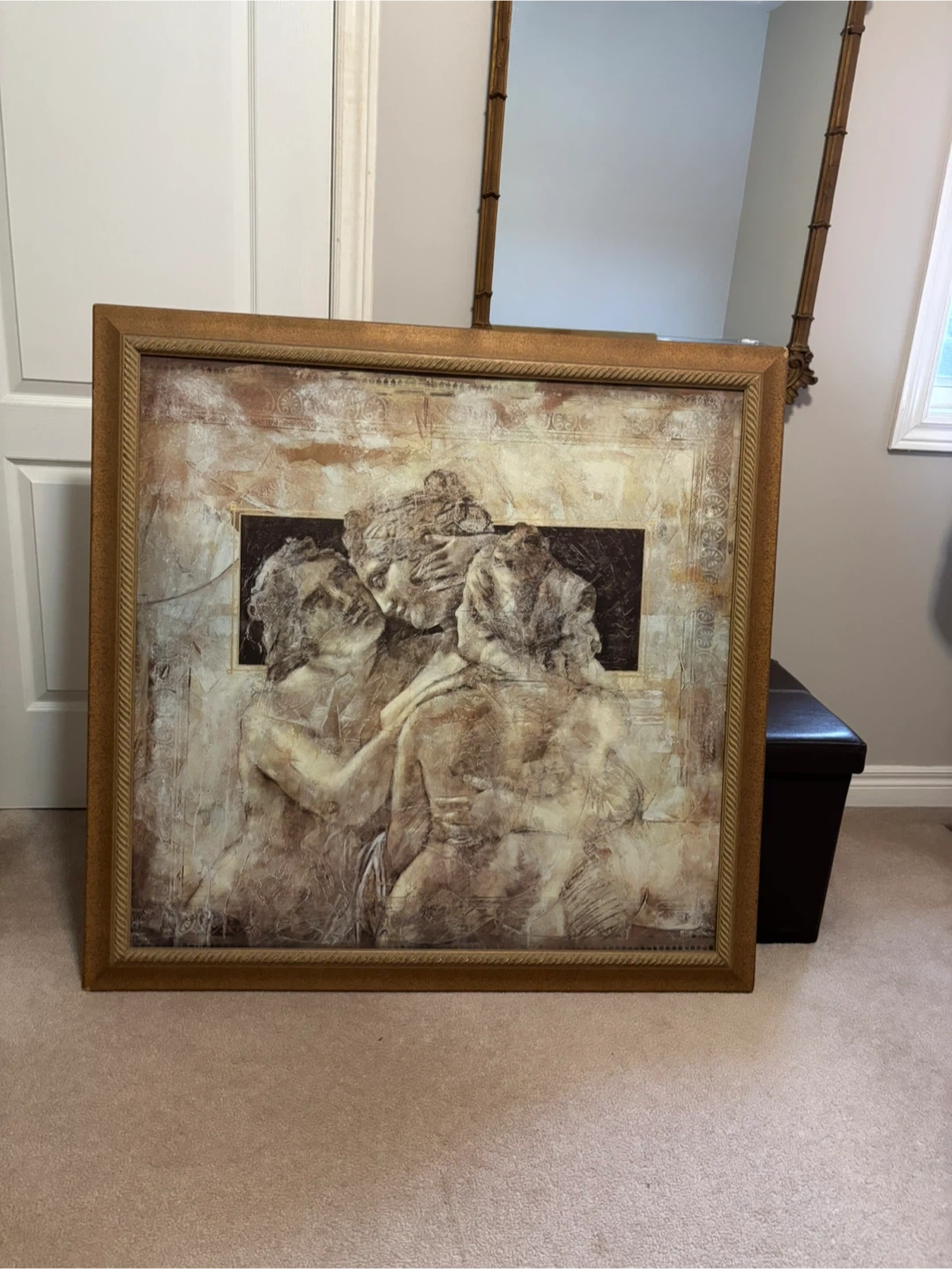 Large framed wall art featuring an abstract depiction of figures. The print has a textured finish and is housed in a gold-toned ornate frame. It's a striking piece that'll add character to any room.