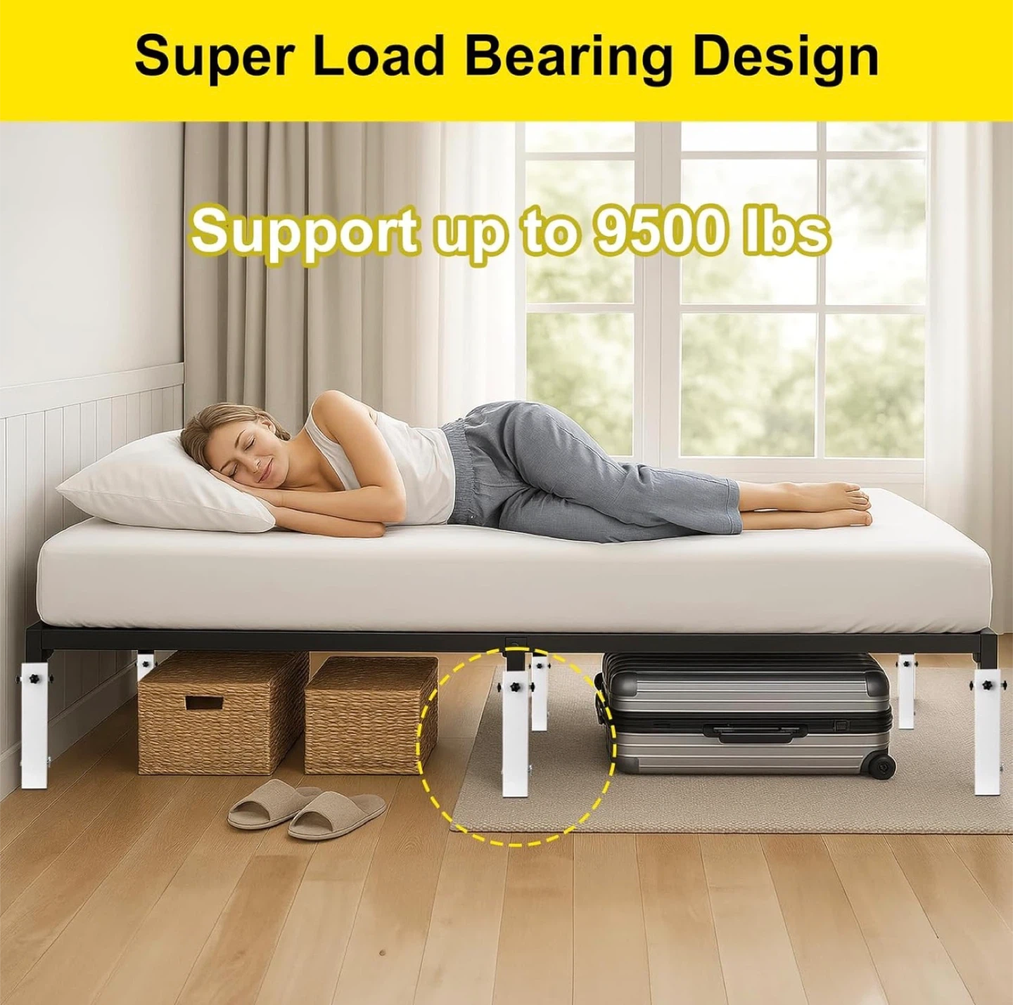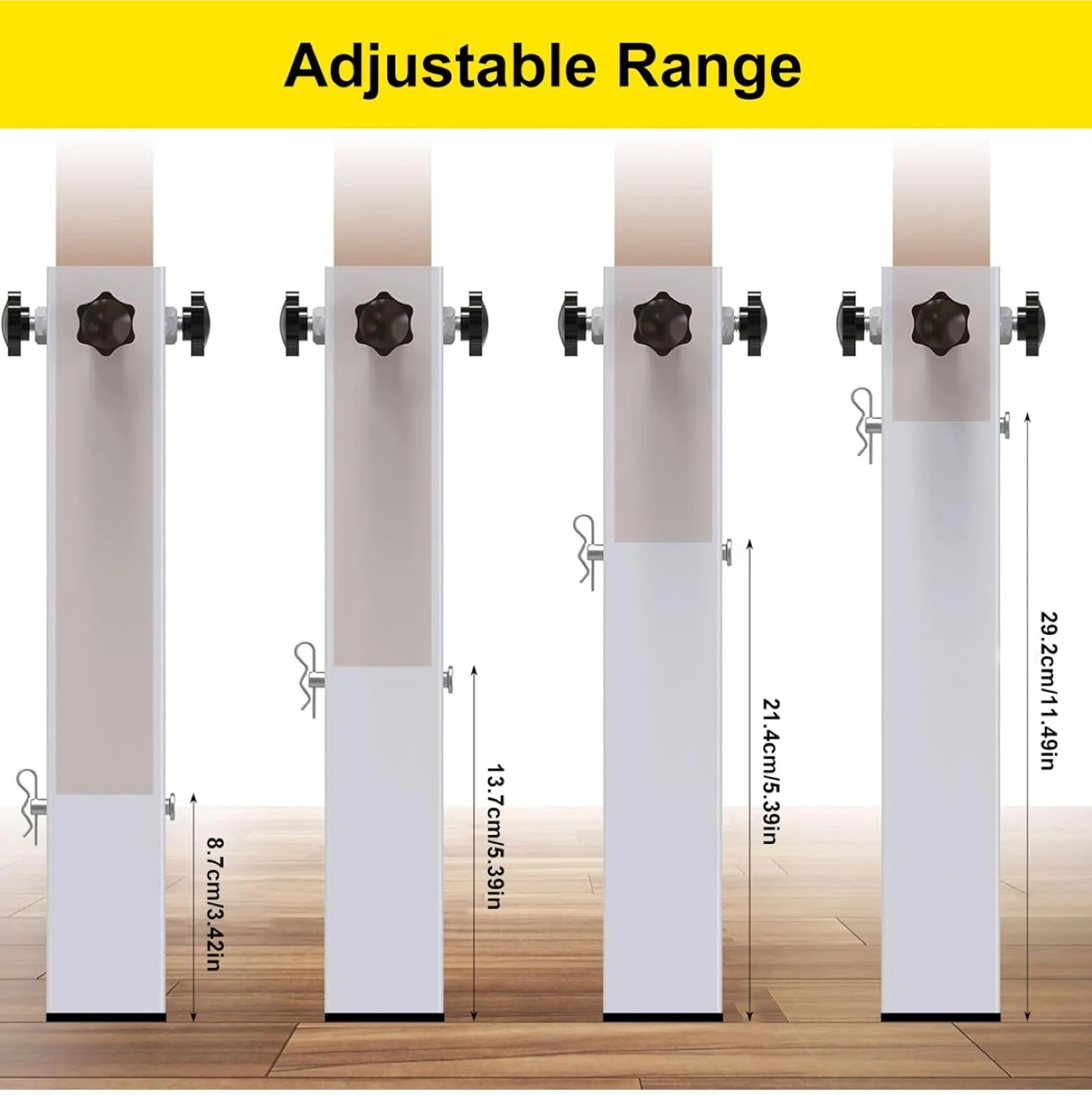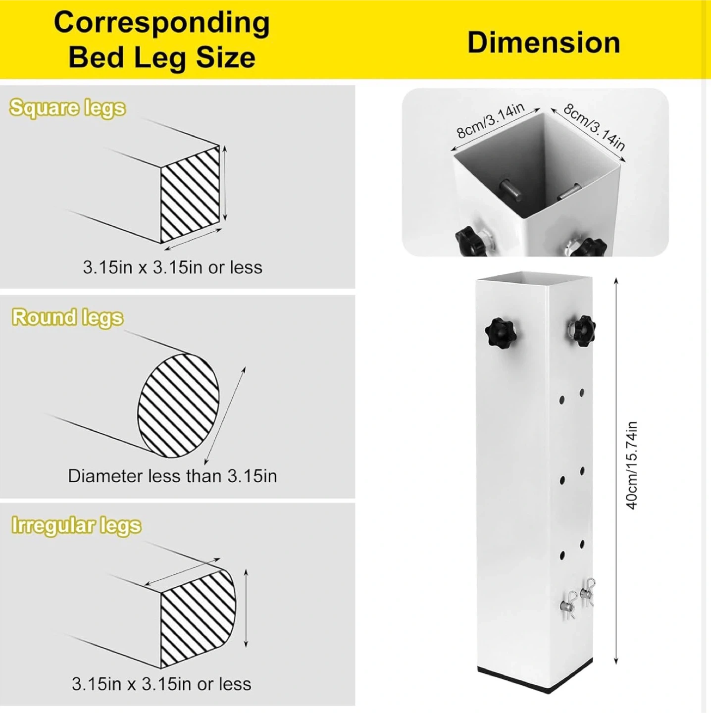 Four adjustable bed legs with a super load-bearing design, supporting up to 9500 lbs. These legs are 40cm/15.74in in height and can fit square, round, or irregular legs with a size of 3.15in or less. The adjustable range for height is 8.7cm/3.42in to 29.2cm/11.49in.