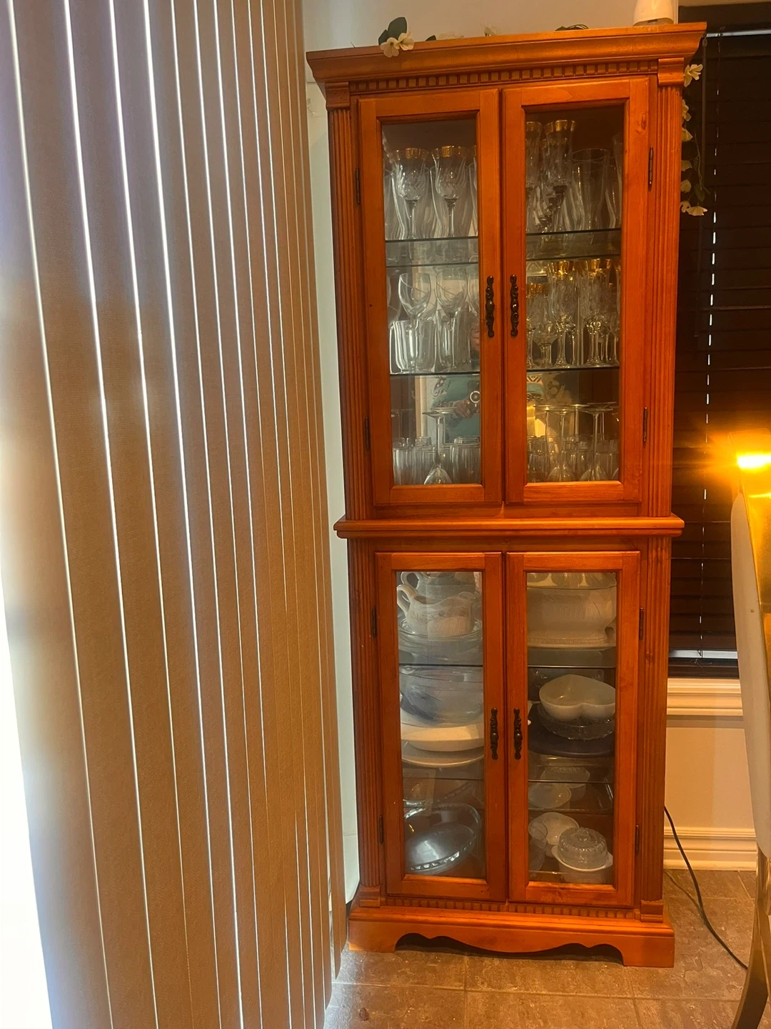 A lovely two-section china cabinet with glass doors, perfect for displaying your dishes and glassware. It's made of wood and features adjustable glass shelves.