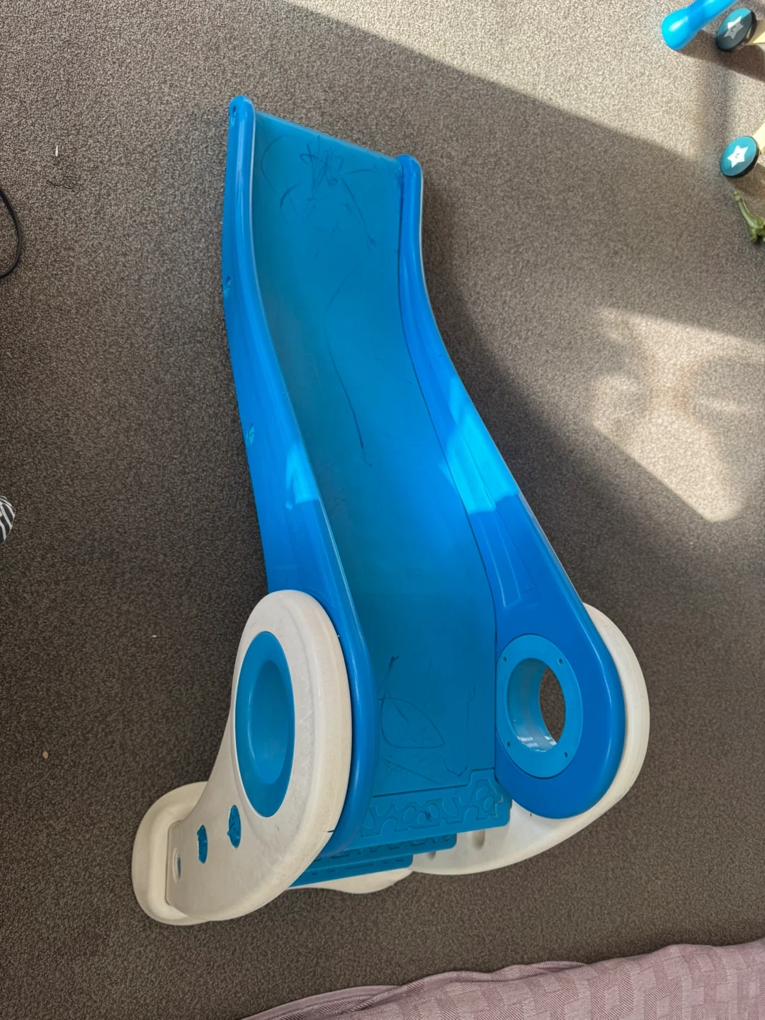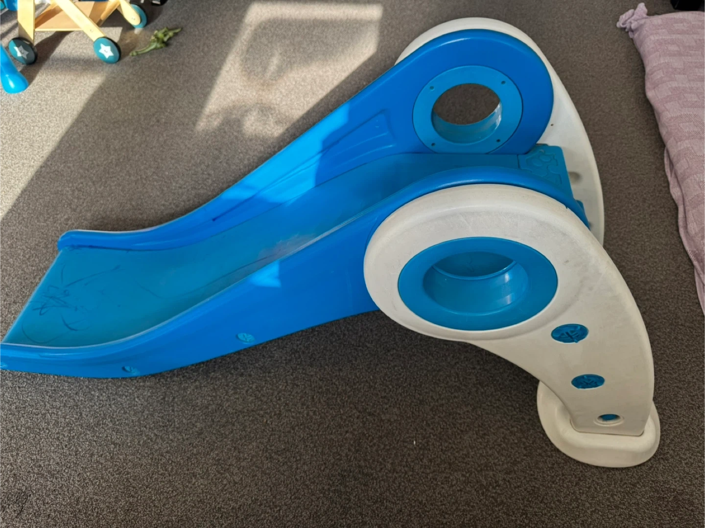 A fun blue plastic slide for kids. It's great for indoor or outdoor play. Features easy-grip handles and a gentle slope for safe sliding. Perfect for toddlers and young children!
