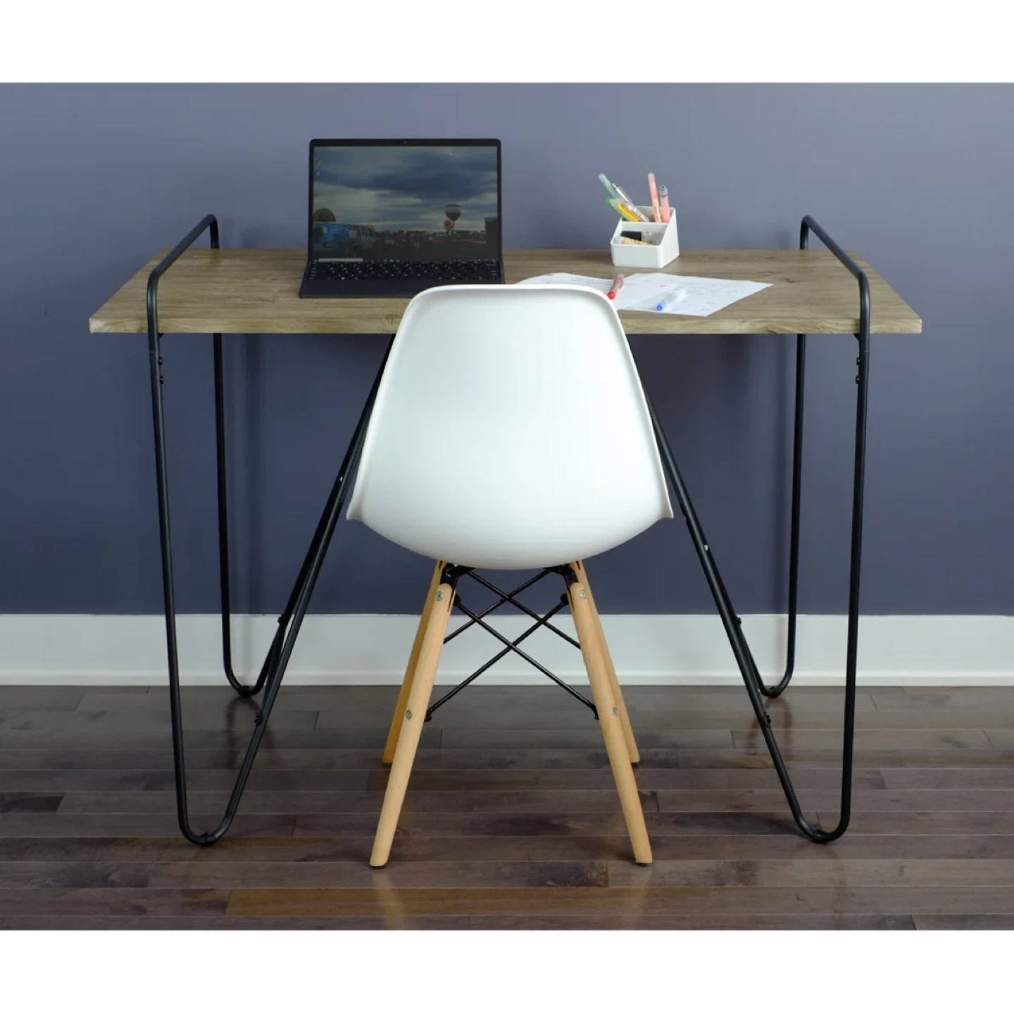 This desk features a rustic wood grain laminate top and sturdy black metal hairpin legs. It's a great size for a small workspace or study area. Some minor wear is visible on the edge of the desk top.