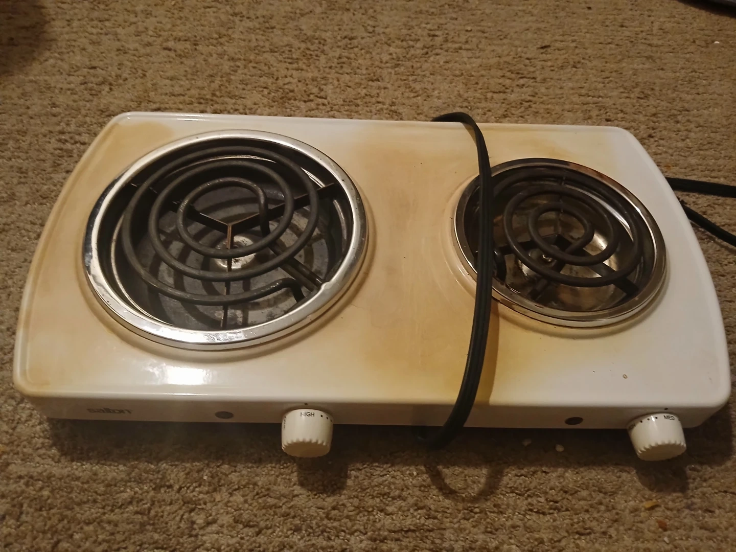 This is a Salton double burner electric hot plate. It has two coil heating elements with adjustable temperature knobs. The unit is white and shows some signs of wear, including discolouration on the top surface. It's functional and ready for use. Am open to any offer but pickup only