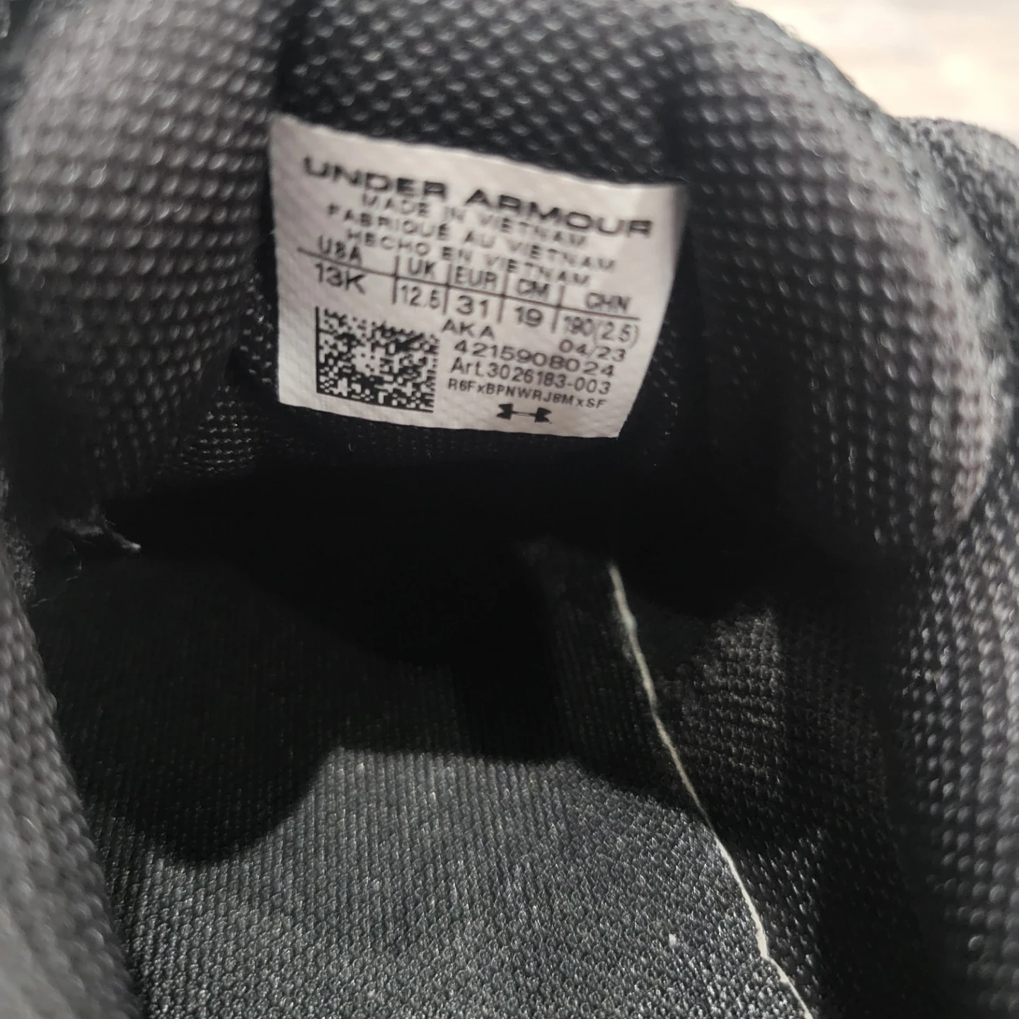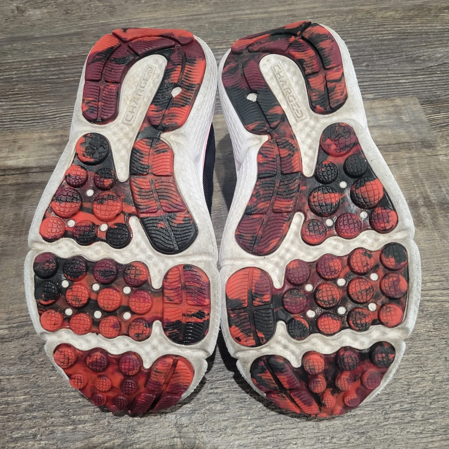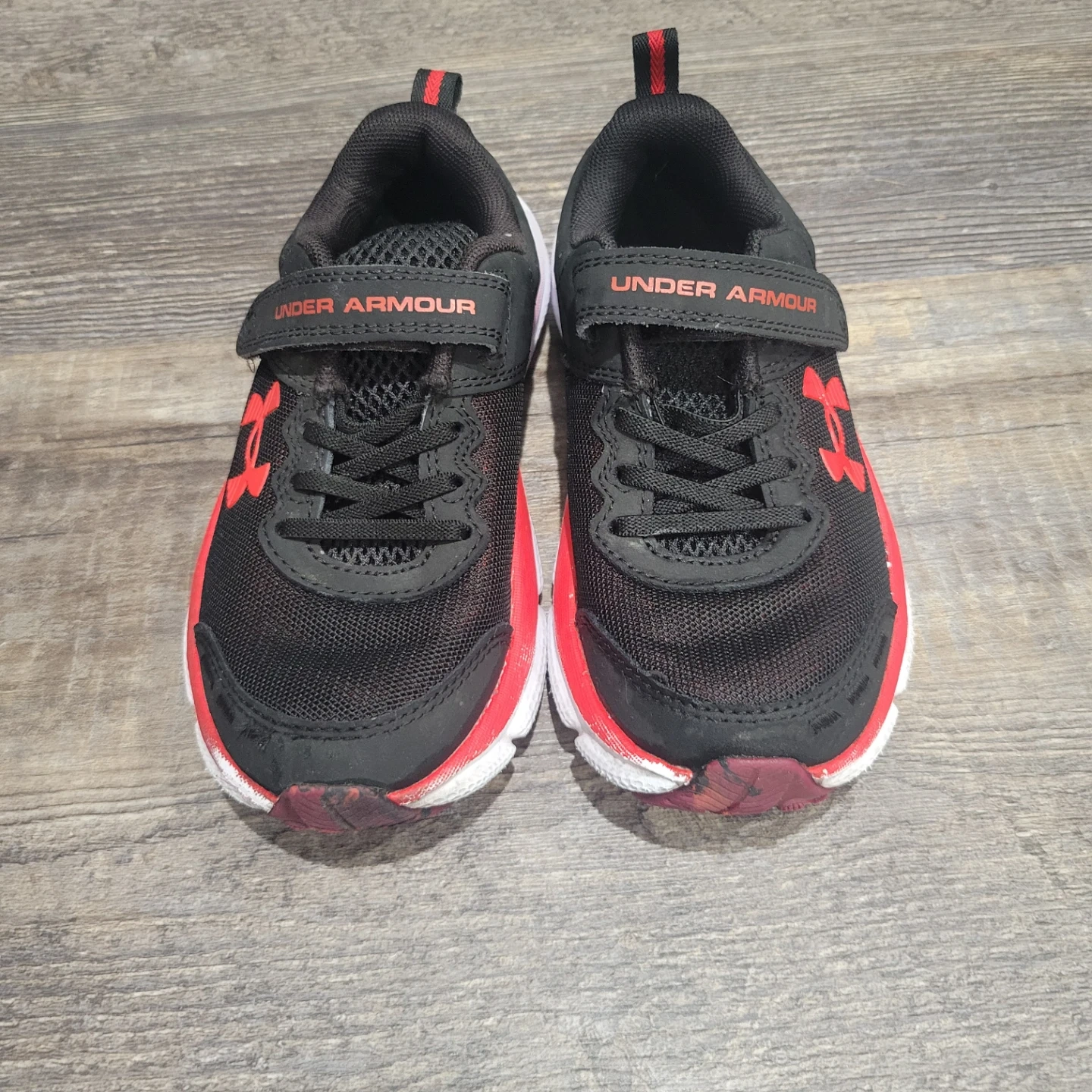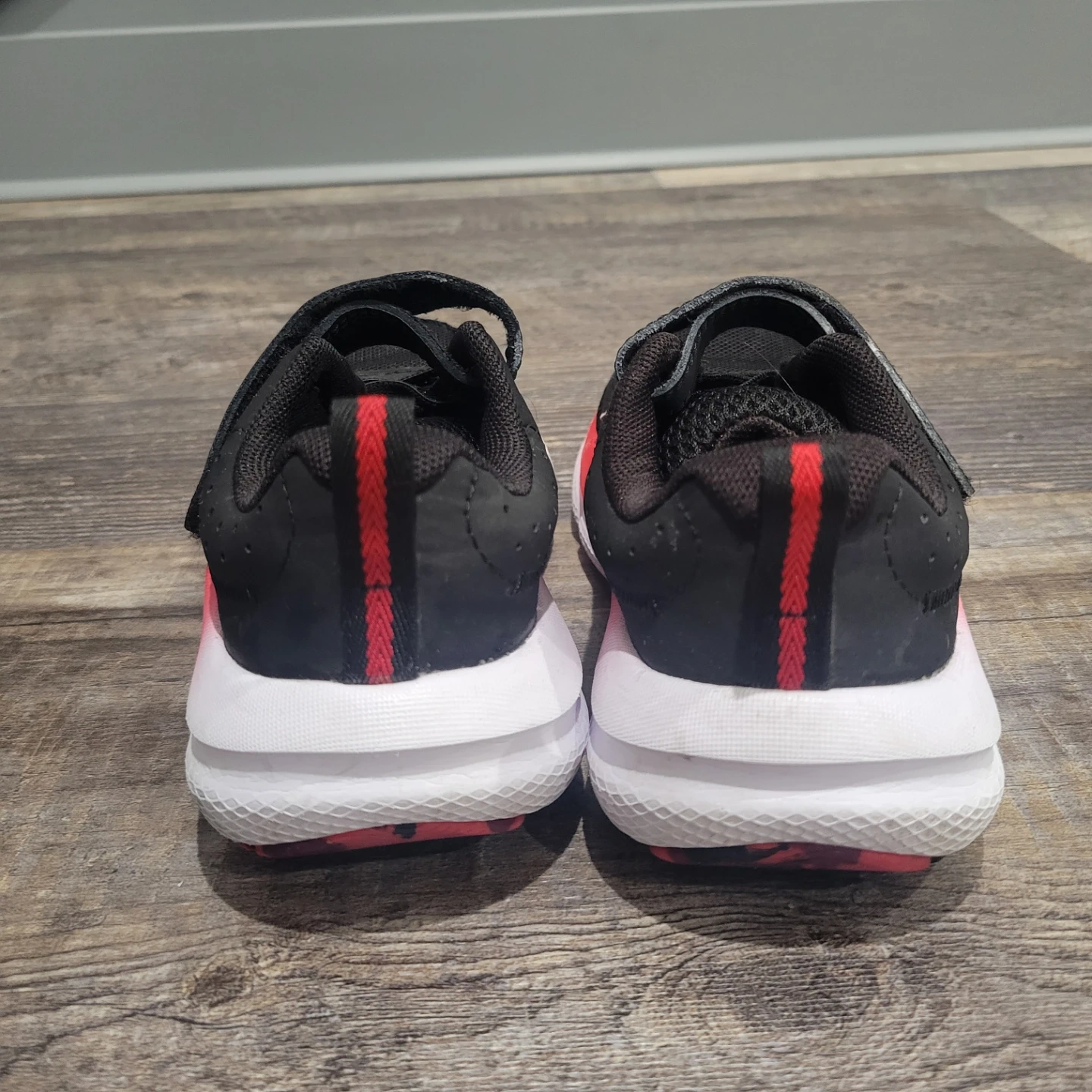 These black Under Armour running shoes feature a red and white sole with velcro straps for easy fastening. The mesh upper provides breathability, and the rubber outsole offers good traction. These are kids' shoes with a sporty design. Used for indoor only.