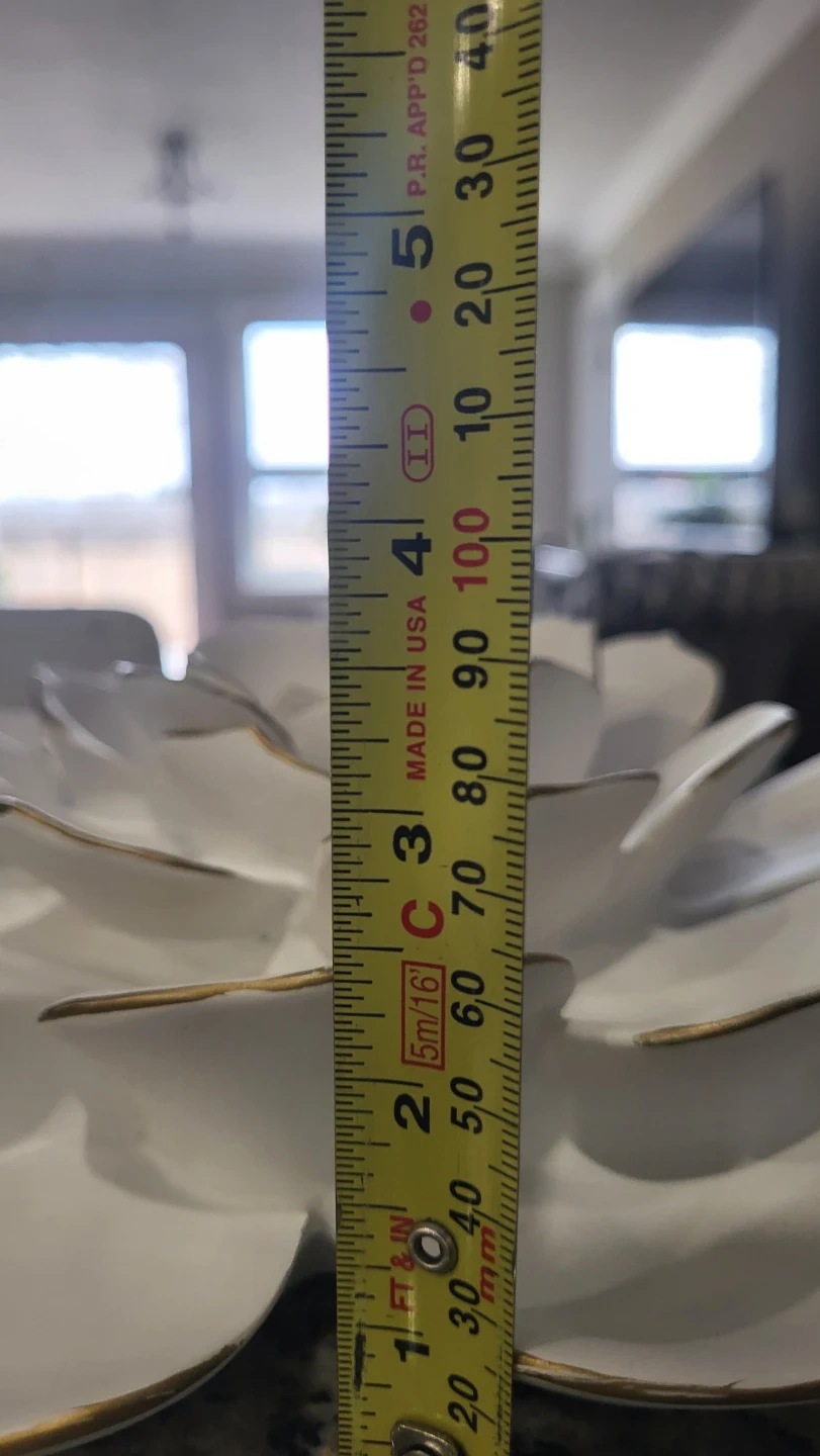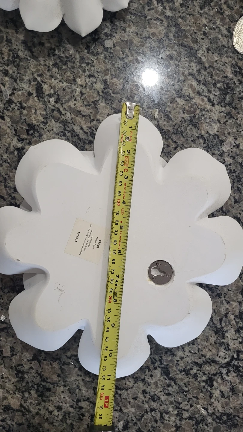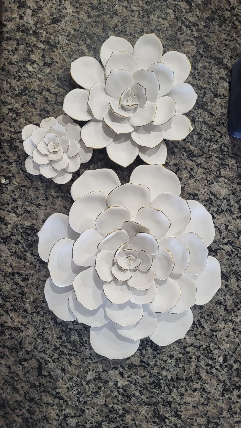 This set includes three white succulent-shaped wall art pieces, each with a delicate gold trim. The largest piece measures approximately 12 inches in diameter, with two smaller pieces included. They're designed for wall mounting. These decorative pieces add a touch of floral elegance to any room!
