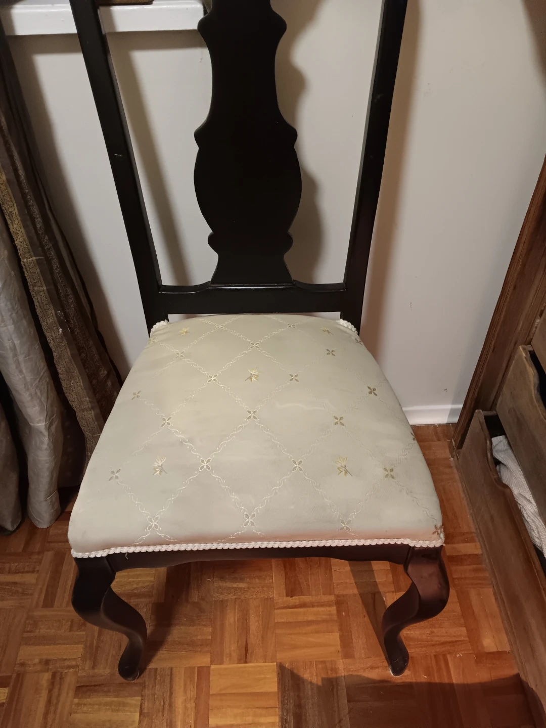 Dark wood dining chair with a patterned upholstered seat. It has a high back with a decorative shell carving at the top. This chair would make a lovely addition to a dining room or accent piece for any room. Light stains on fabric.