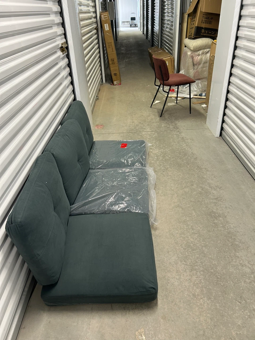 This is a dark grey modular. It's made of fabric and has tufted back cushions. It includes Three Seat cushions and three back cushions.