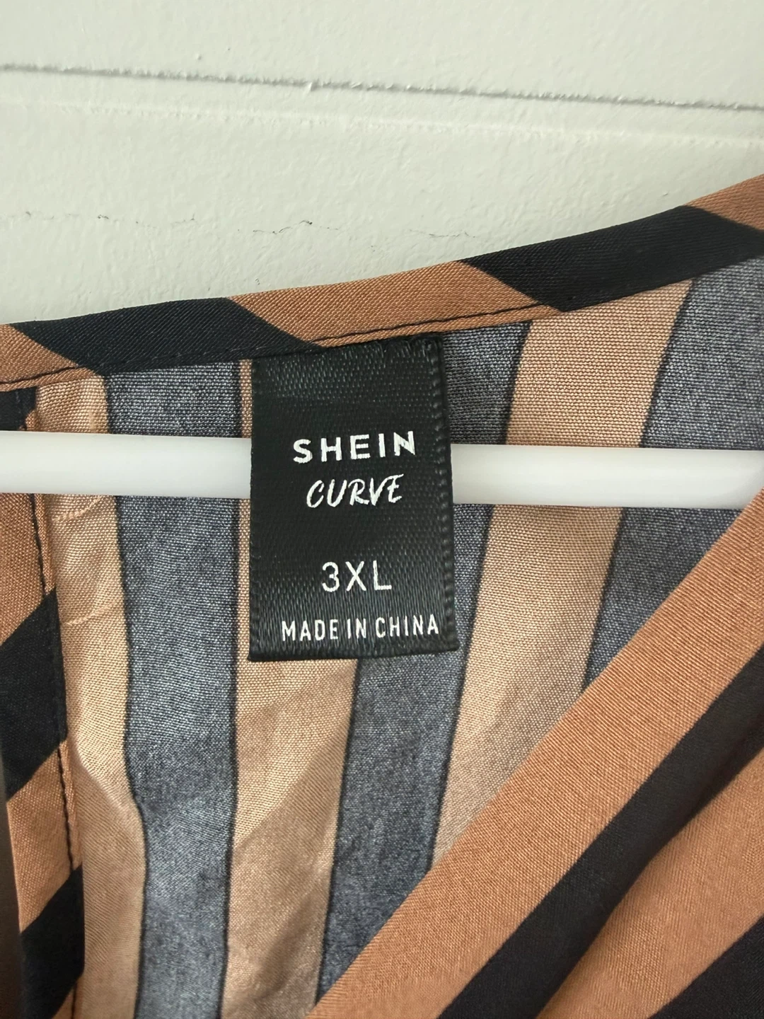 SHEIN Curve jumpsuit in size 3XL. Features a striped pattern on the top with black sleeves and a solid black bottom. Made in China.