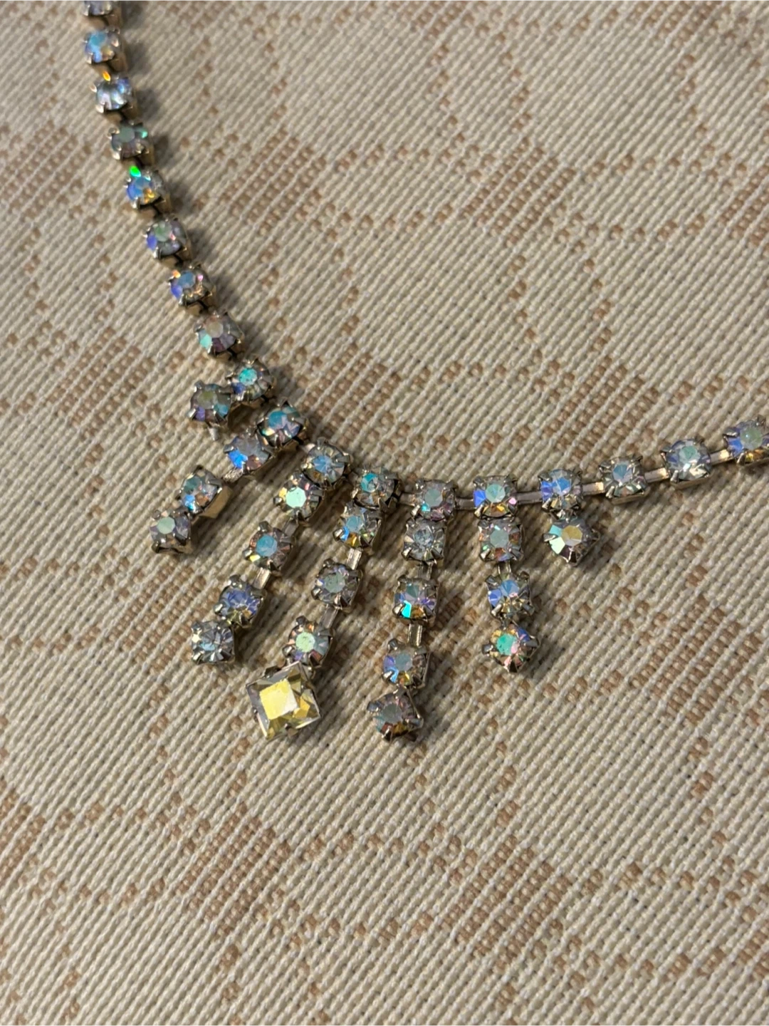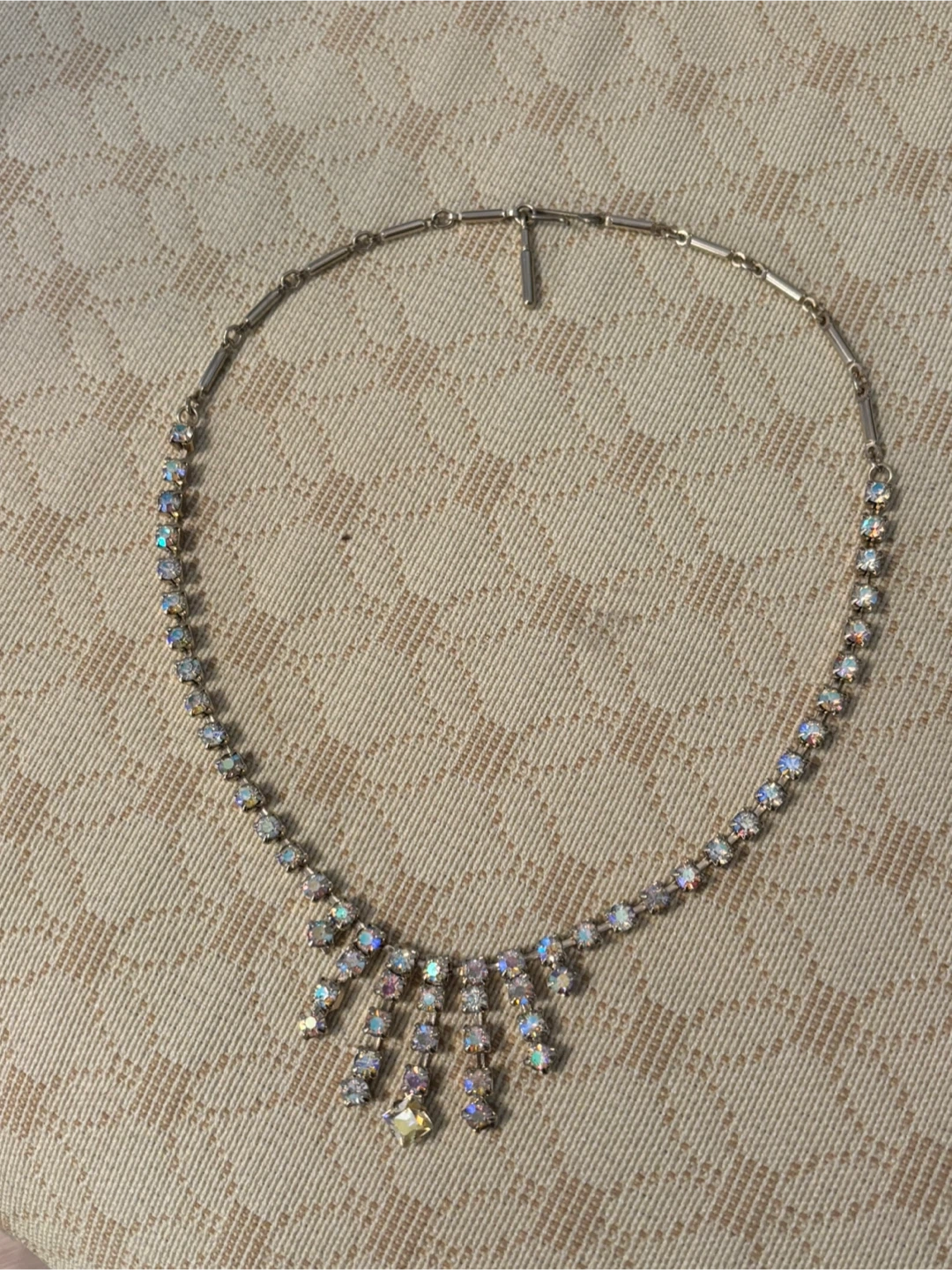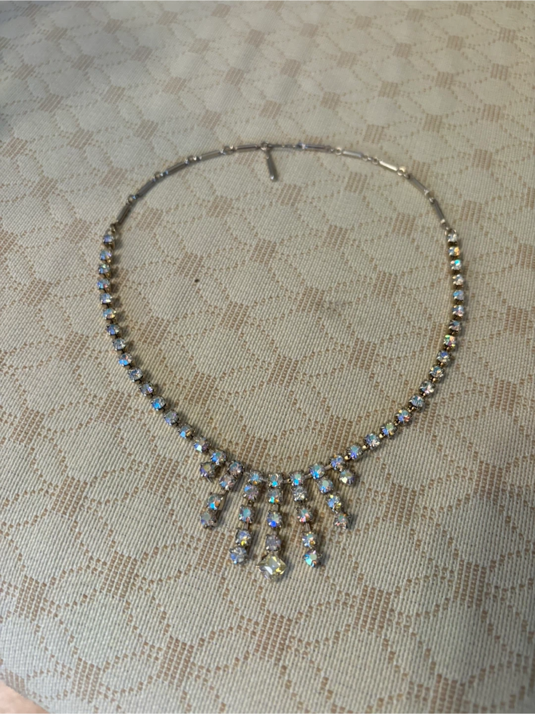 15This is a beautiful rhinestone necklace with a dangle design. It's in great condition and would be a lovely addition to any outfit!