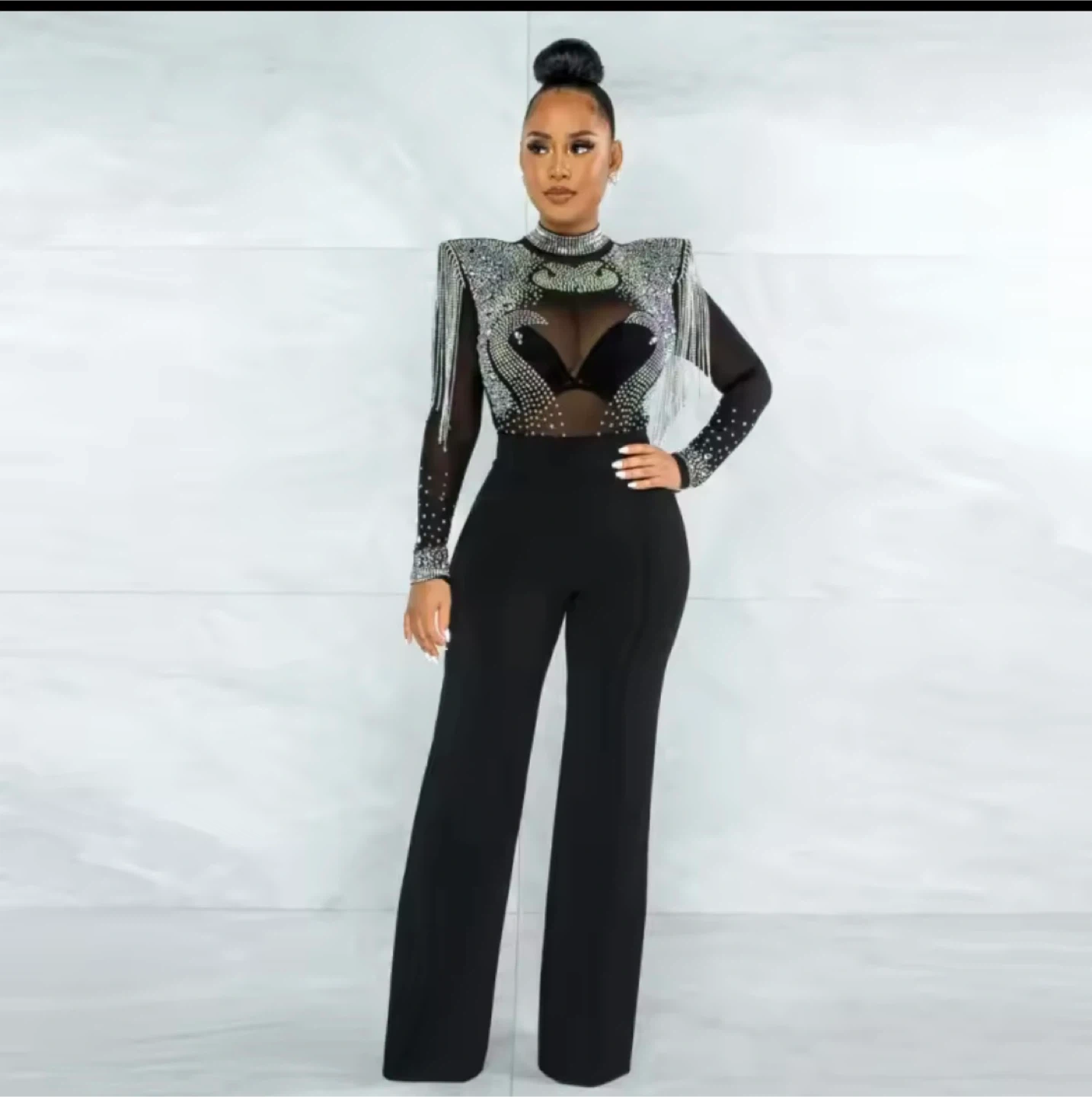 105This is a beautiful jumpsuit with rhinestone detailing and fringe accents. It features long sleeves and a stylish design. Perfect for a night out or a special occasion!