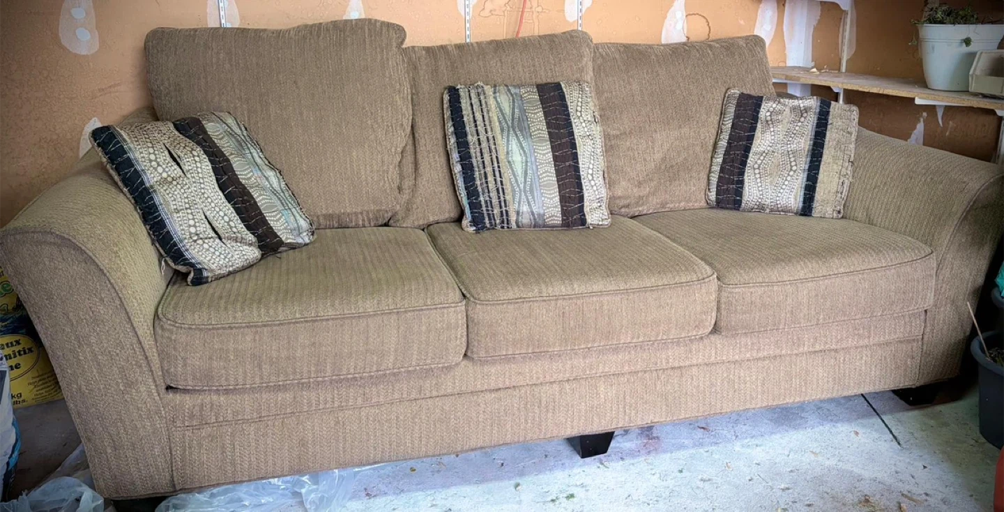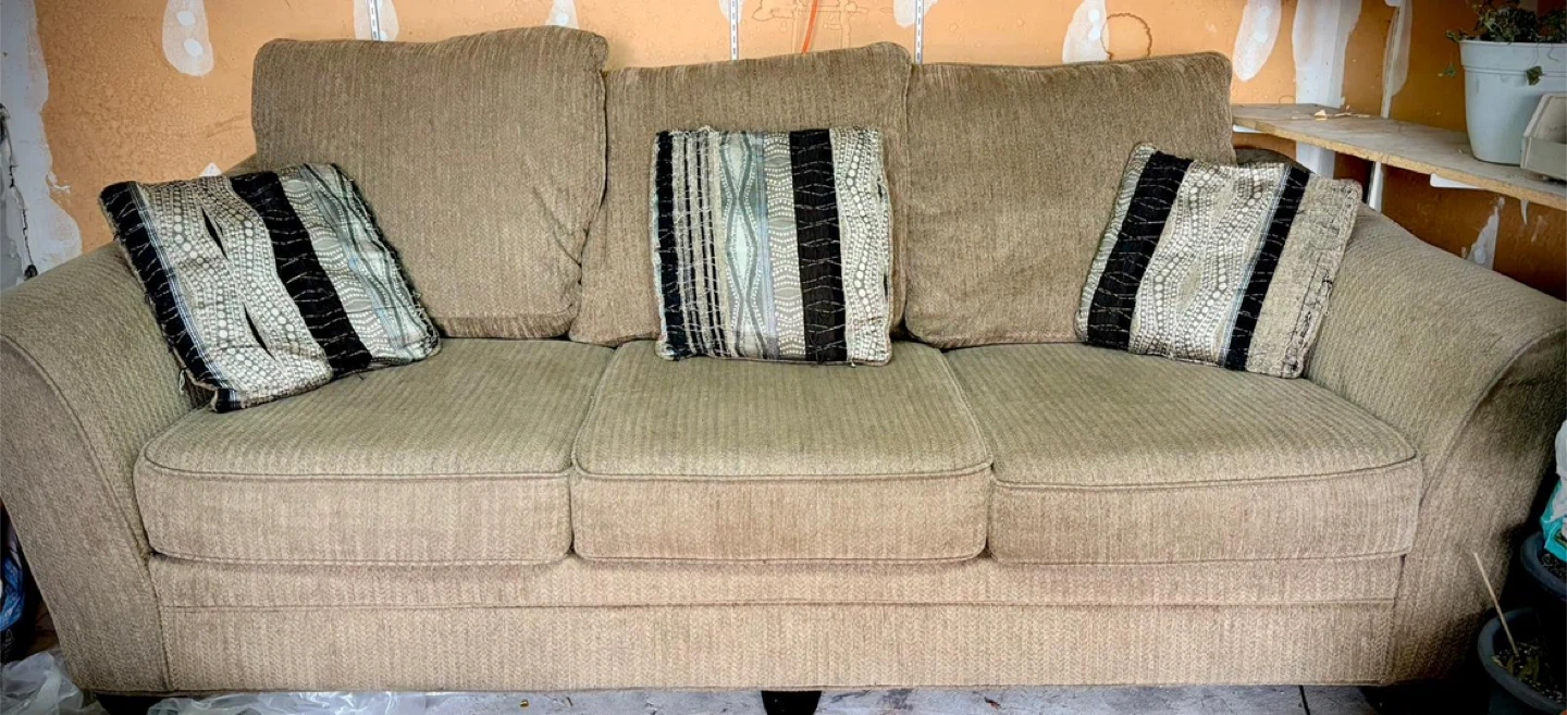 Three-seater sofa in a textured tan fabric. Comes with three decorative throw pillows. Comfortable seating for any living space.
