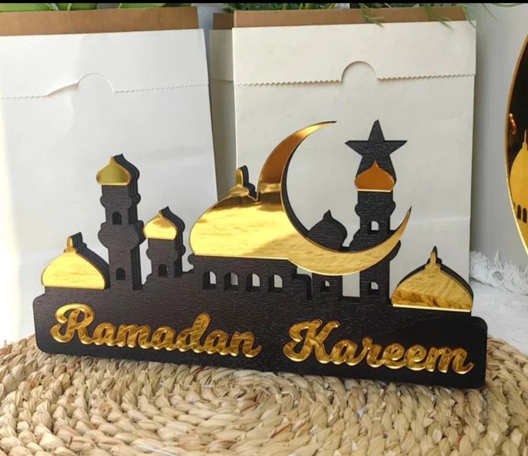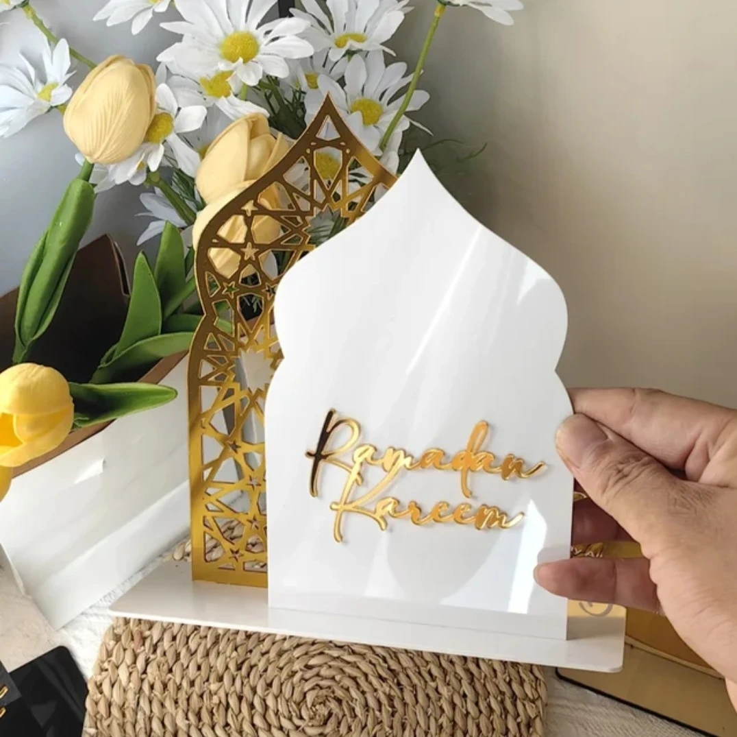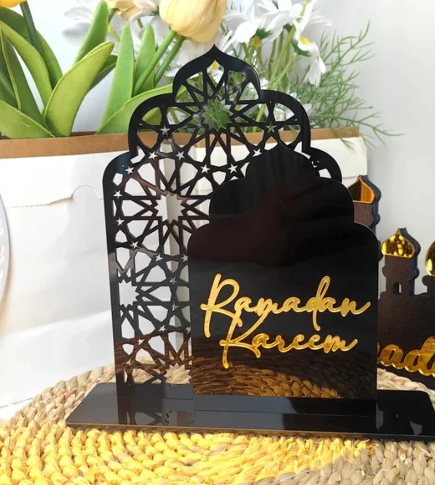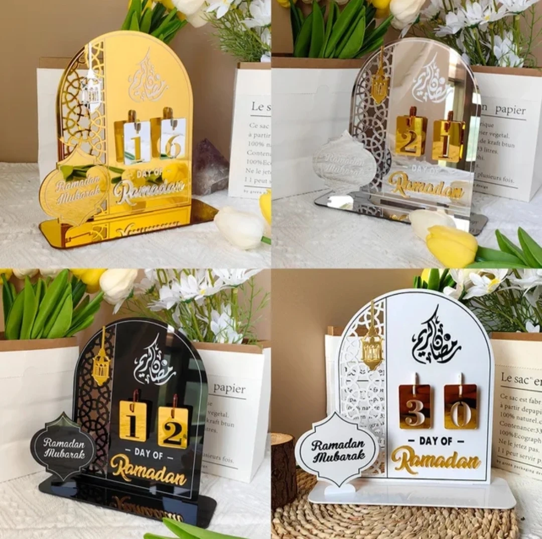 This is a decorative countdown calendar for Ramadan. It features a 'Ramadan Mubarak' sign and a daily countdown for the month. The design includes Arabic calligraphy and a lantern motif.