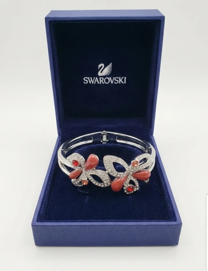 Beautiful Swarovski crystal bangle bracelet with a butterfly design. It features a silver-tone metal band adorned with clear crystals and coral-coloured accents. This piece comes with its original Swarovski box.