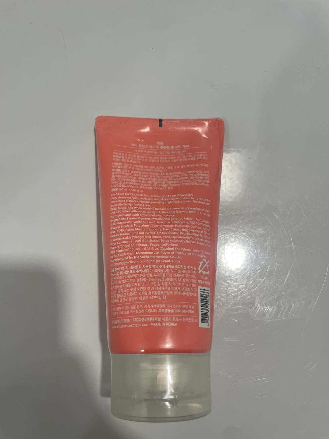 This is the Saem Shine Berry Cleansing Foam. It's a facial cleansing foam. The volume is 150 ml or 5.07 fl. oz. It's made in Korea.
