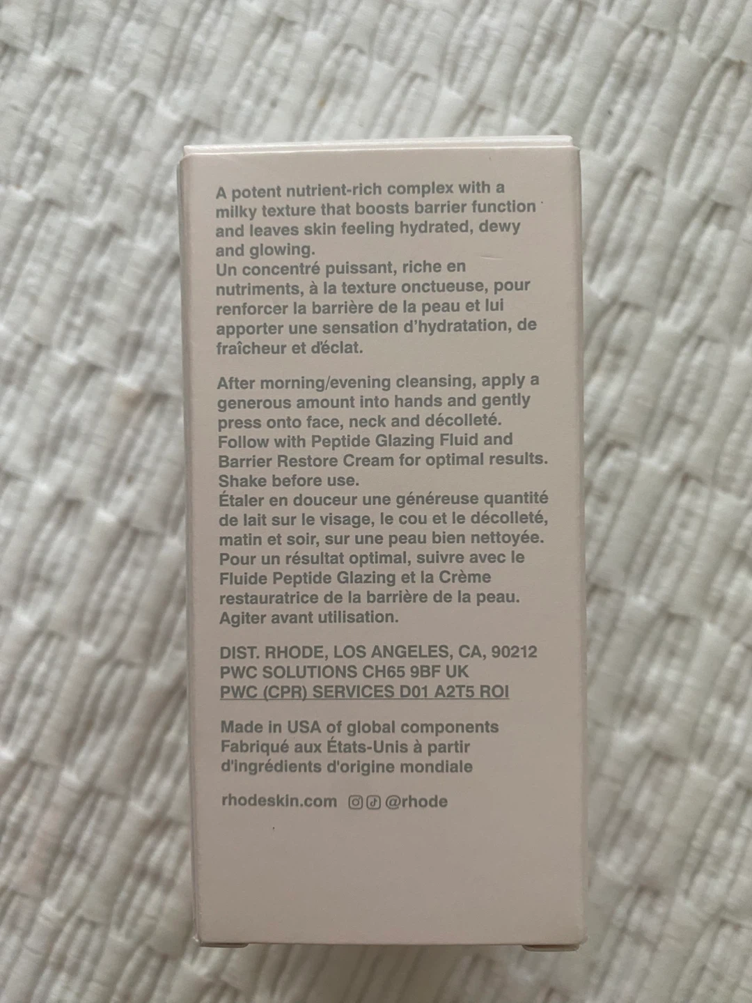Selling a Rhode Glazing Milk, a ceramide facial essence. It comes in a 65 mL / 2.2 fl oz size. Perfect for hydrating and soothing your skin. Only used twice and I loved it but sadly did not agree with my skin. I have heard amazing reviews from other people though. Looks beautiful and dewy on a bare face or under makeup.