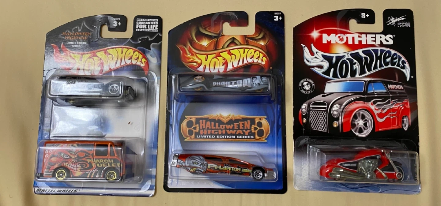 Hot Wheels, Halloween Highway Limited Edition Series. "Pharaoh Fueled" van and two "Phantom" models and Mothers Hot Wheels collaboration motorcycle.