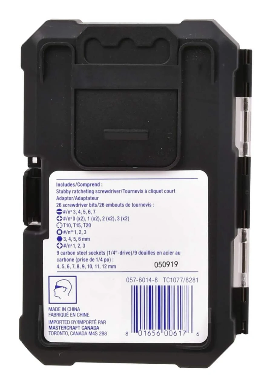 This 37-piece set includes a stubby ratcheting screwdriver and 26 screwdriver bits. It also comes with 9 carbon steel sockets. Includes the original case for easy storage.