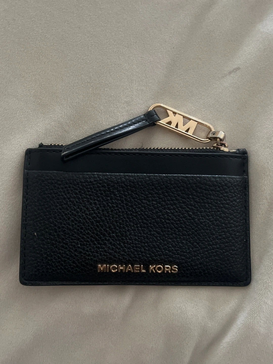 This Michael Kors card holder is black with multiple card slots and a zippered compartment. It's made of pebbled leather with gold-tone hardware. Keep your essentials organized and secure!