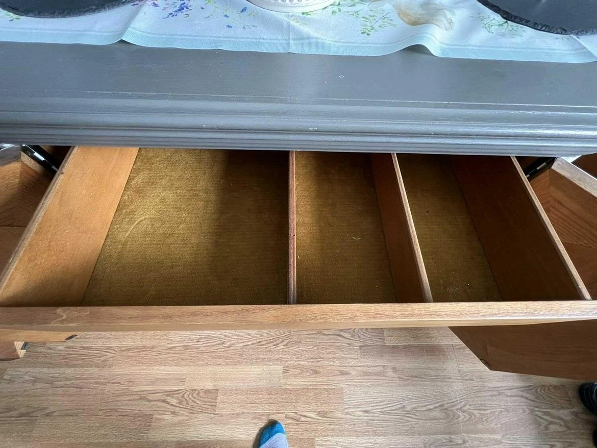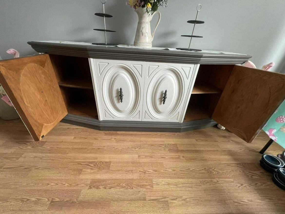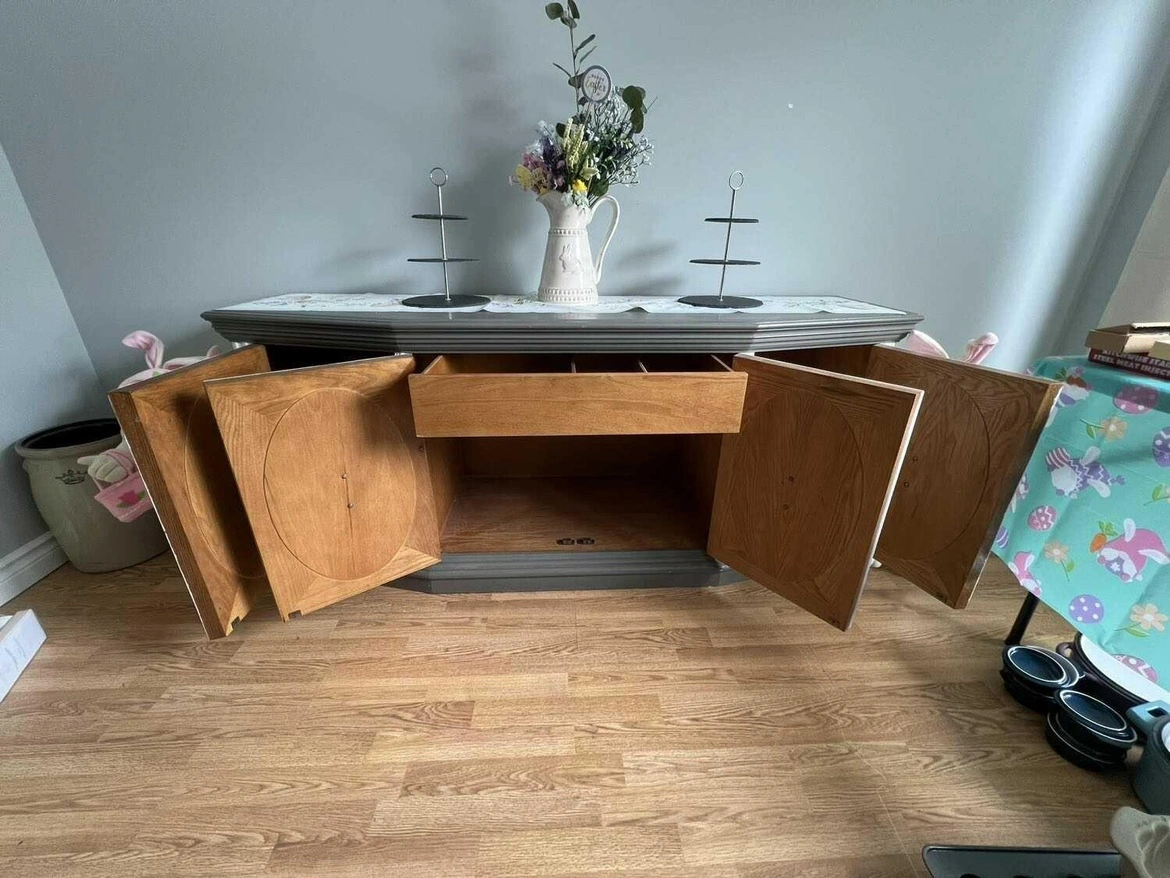 Four doors, one drawer. The doors have a curved shape and the top has an oval shape. The interior has a shelf in each cabinet and one felt-lined drawer with dividers. It is in good used condition. The piece is well-made and strong.