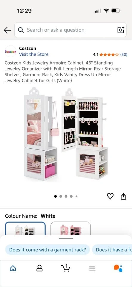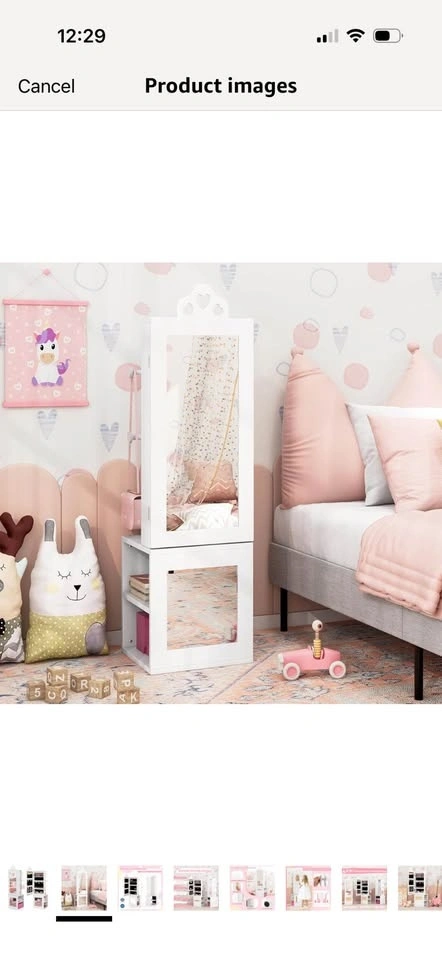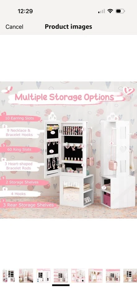 Brand new in opened box! See photos for slight imperfection around frame on mirror. Little bit of I’m assuming glue which could probably come off. Priced due to this. Multifunctional Kids Jewelry Armoire: Designed to meet all your little one's fashion needs, this kids jewelry cabinet blends a full-length mirror and clothes rack. Featuring cute heart-shaped cut-outs, it is not just a piece of furniture but also a charming decoration that suits any girl's bedroom. Multiple Storage Options: There are 10 earring slots, 9 necklace & bracelet hooks, 60 ring slots, 3 heart-shaped bracelet rods and 2 storage shelves inside the jewelry armoire. Plus, 3 rear storage shelves and 4 hooks offer additional space for kids to arrange clothes, bags, shoes, etc. Clear Full-length Mirror: This freestanding jewelry organizer comes with 2 real glass mirrors, which are crafted to reflect true colors and styles from head to toe, providing enhanced daily dressing up fun for your kids. Outstanding Stability: Built with your child's safety in mind, this floor jewelry armoire includes an anti-toppling device, ensuring a secure and worry-free setup in any room. Exquisite Craftsmanship: With the cut-out handle and built-in magnetic catch, the cabinet door can be opened conveniently and closed tightly. In addition, the anti-slip foot pads are included to protect the floor from scratches. Ideal Gift for Little Princess: Every little girl has a tiny dream of being a shiny princess. This standing jewelry armoire with full-length mirror allows your little one to dress up beautifully every day.