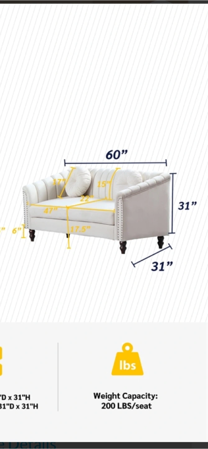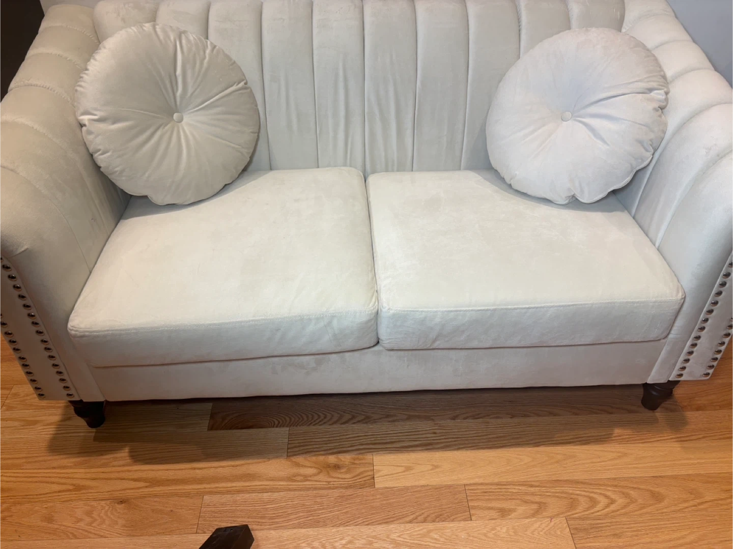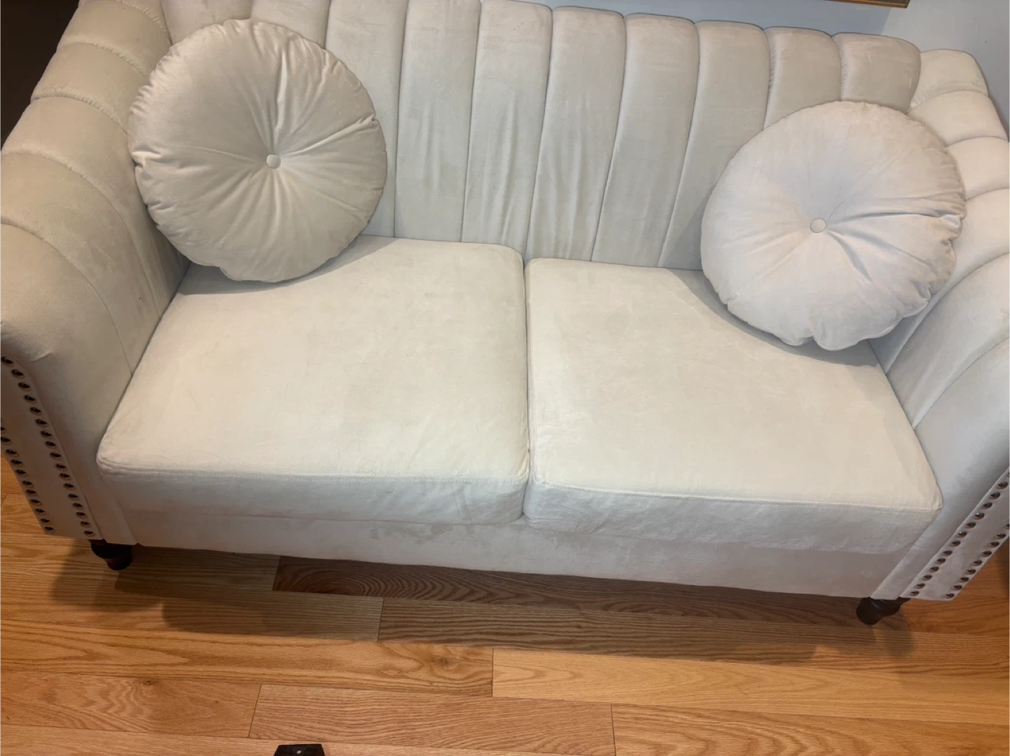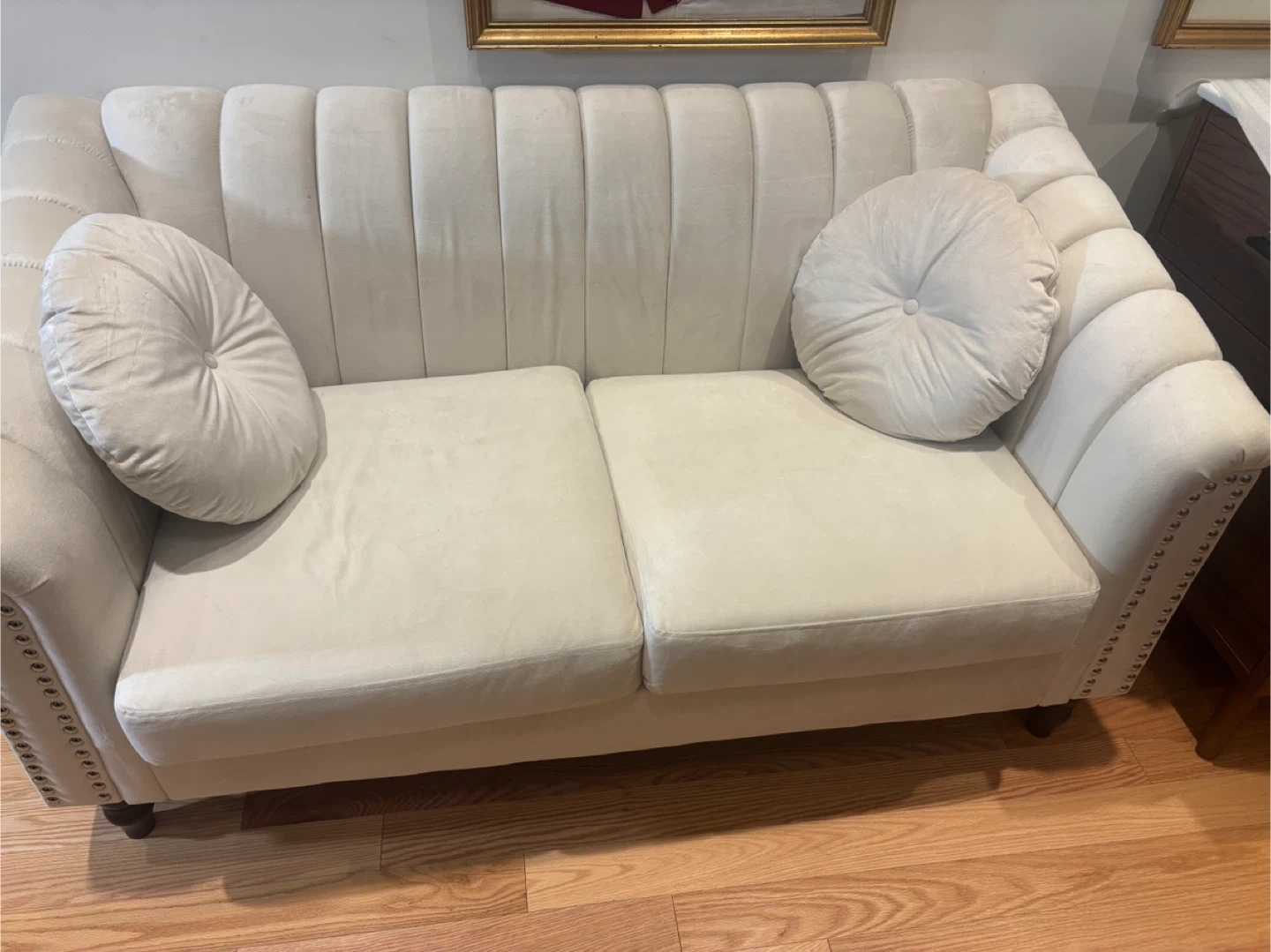 Cream velvet loveseat with studded detailing on the arms and a tufted back. It includes two round decorative pillows. Seat depth is 22 inches and total width is 60 inches. This loveseat's classic design complements various decor styles.