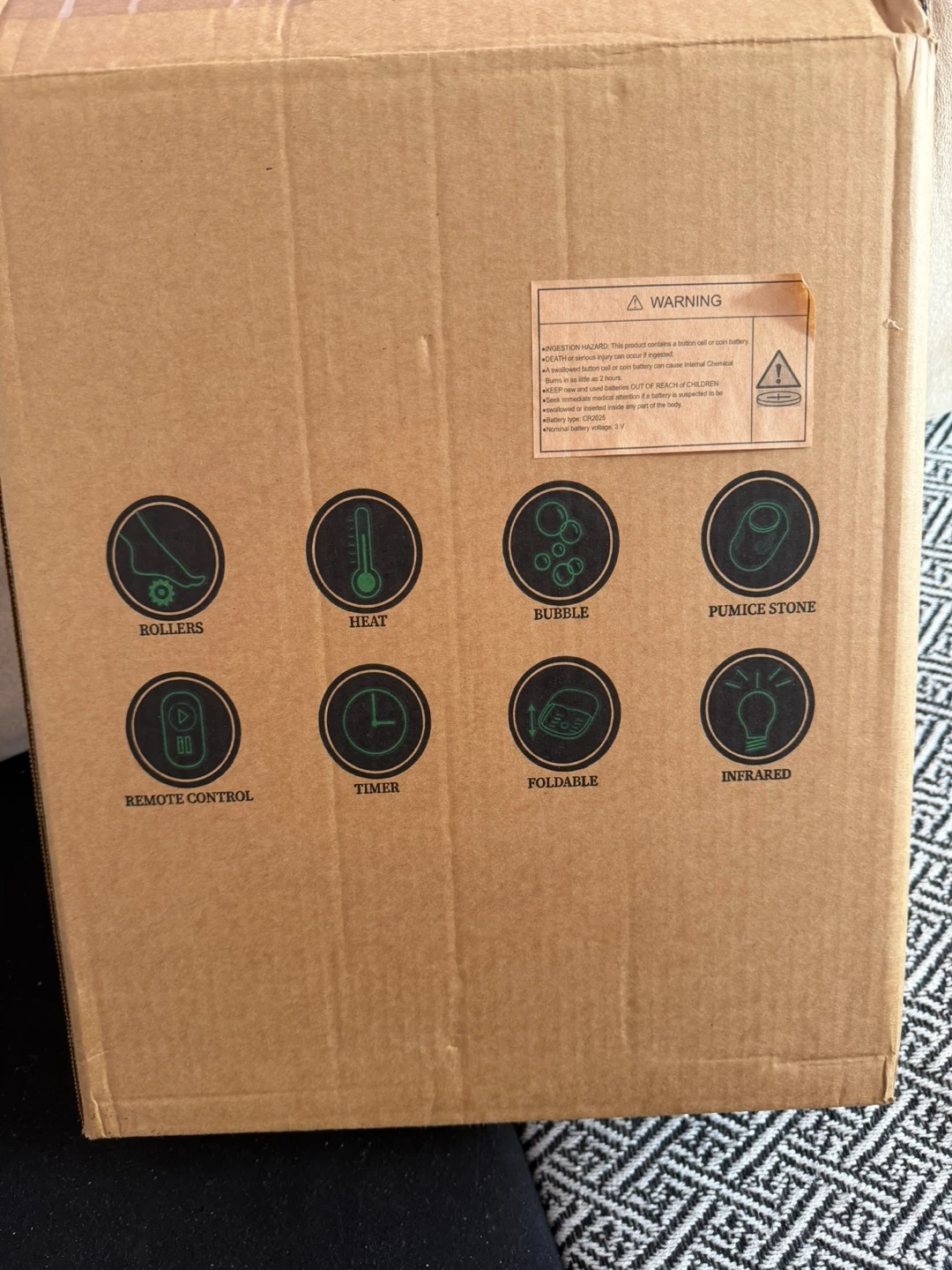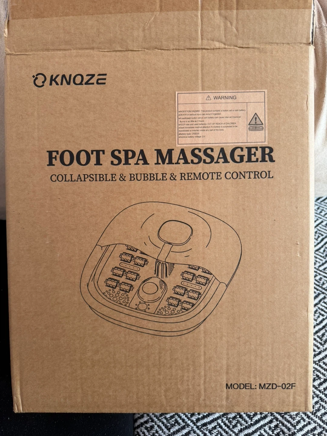 This KNOZE foot spa massager is collapsible and includes bubble function and remote control. It also features rollers, heat, a timer, pumice stone, and infrared capabilities. The model number is MZD-02F.