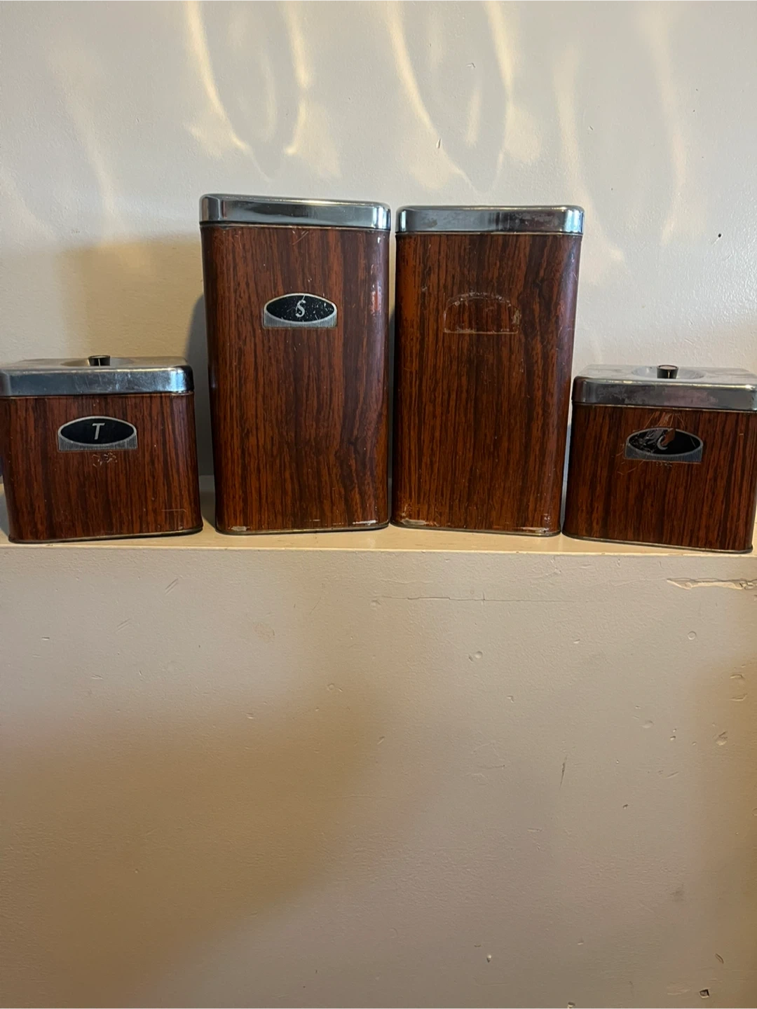 Set of four canisters with a faux wood grain finish and chrome trim. Two canisters have labels, one marked 'T' and the other 'S'. They're great for storing kitchen staples.