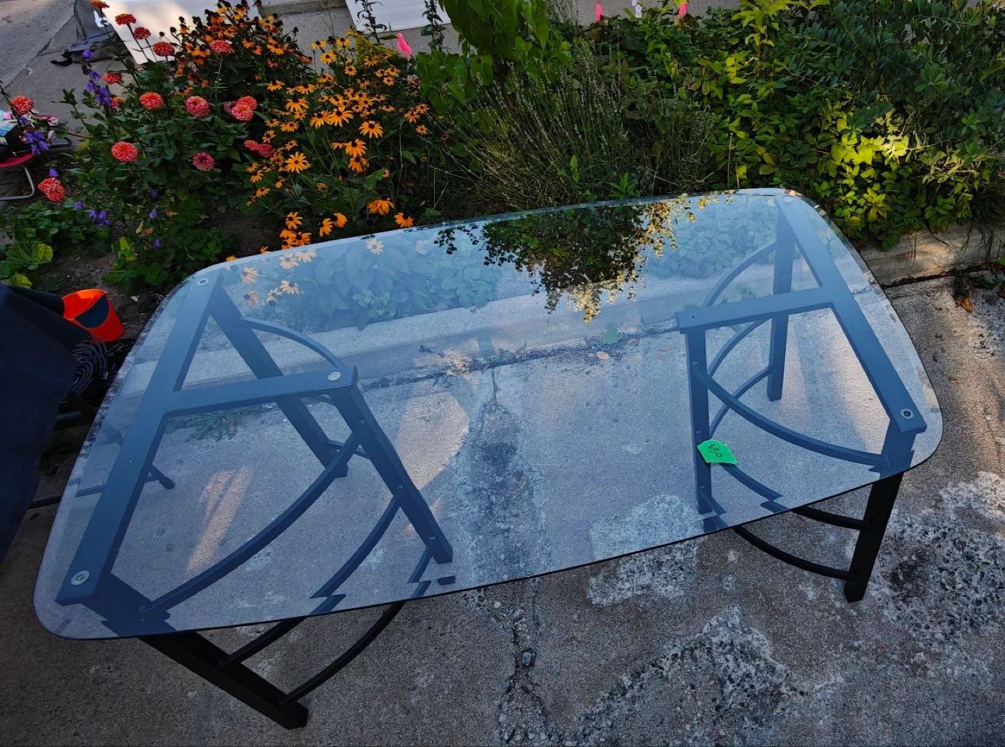 Here's a one of a kind table with a glass top and a black metal frame. It's in great condition and would look great in any living room or den! Missing one support plumger in the middle, easy fix !