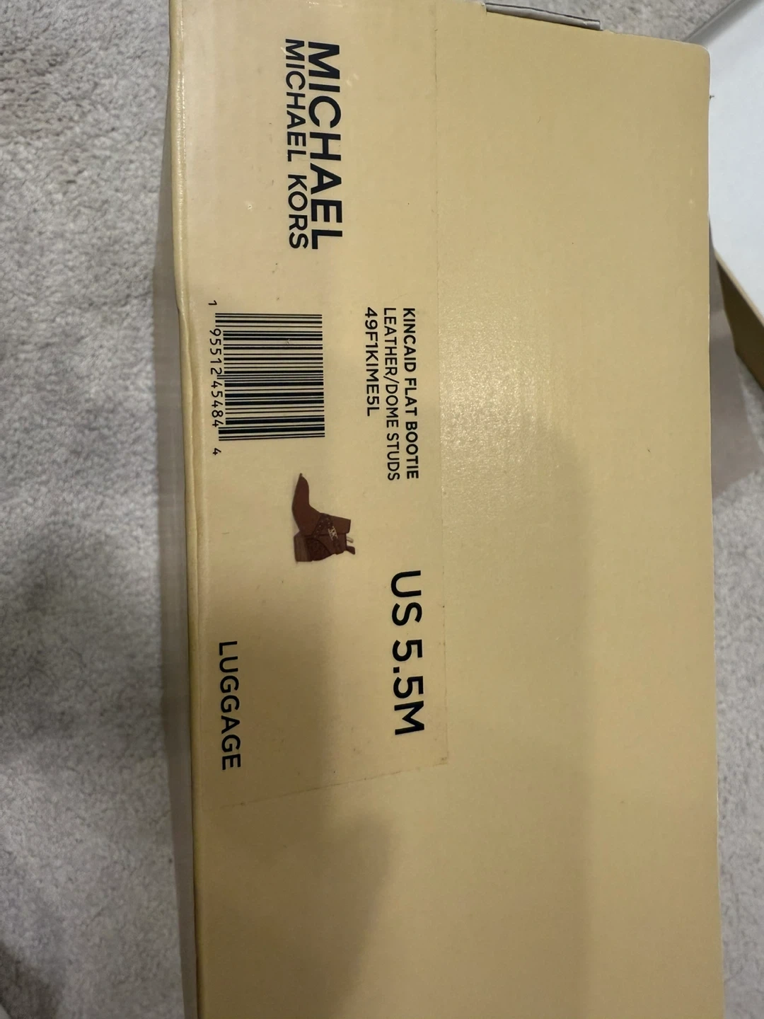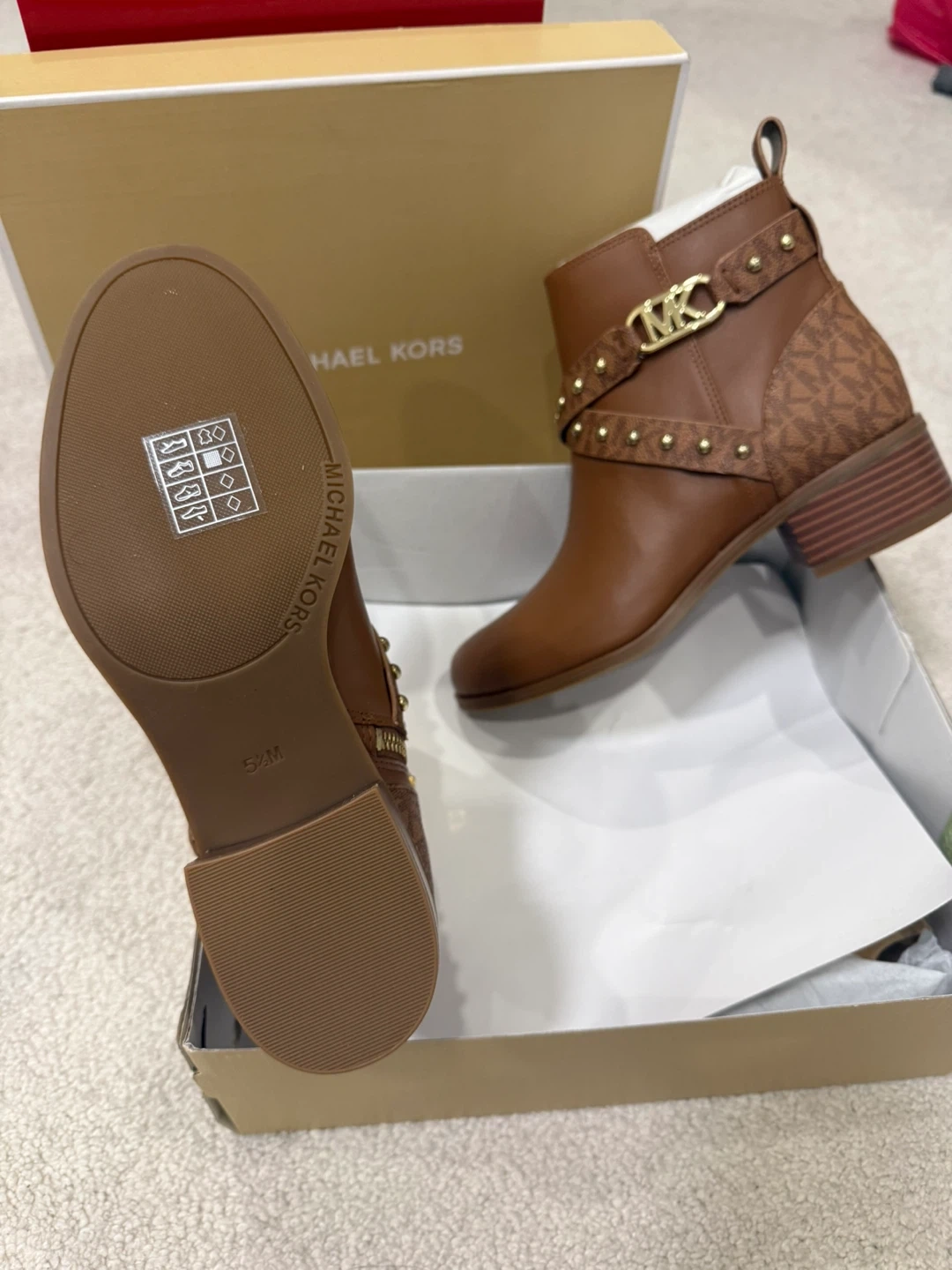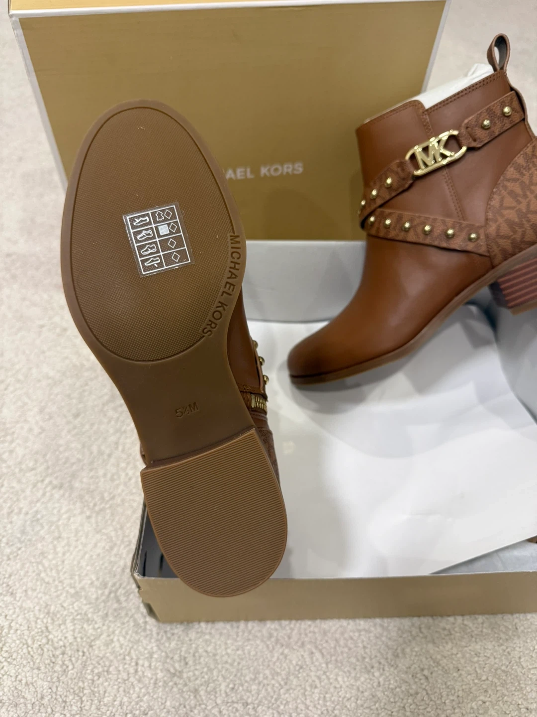 Selling a pair of New Michael Kors Kincaid Flat leather Booties in size 5.5M. These leather/dome stud booties are in new unused condition and come with the original box and all packaging . The colour is Luggage. Perfect addition to your wardrobe or gift to love ones.