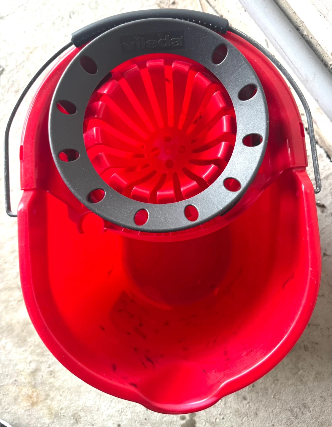 Selling a Vileda Bucket (used), microfibre Vadrouille Mop (brand new. The mop features non-linting fibres and an ergonomic handle. The bucket is red and has a quick wring system for easy and fast spin drying. The mop is still in its original packaging.