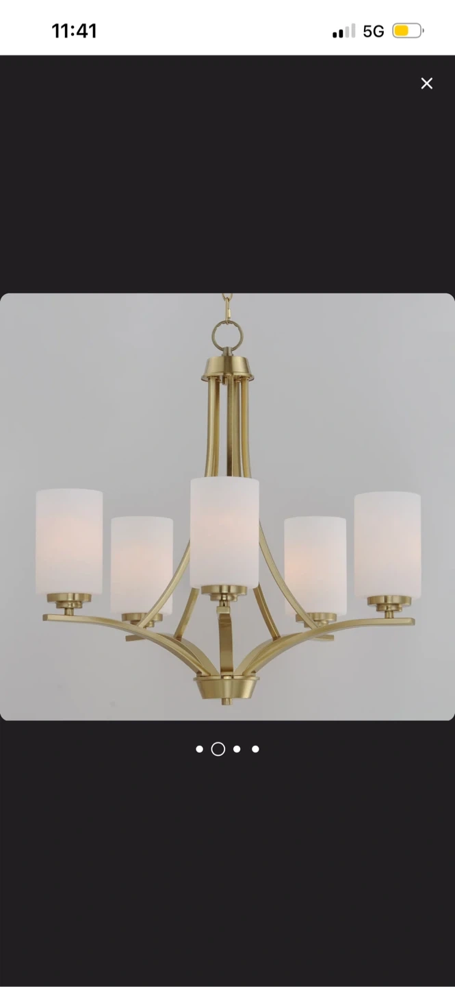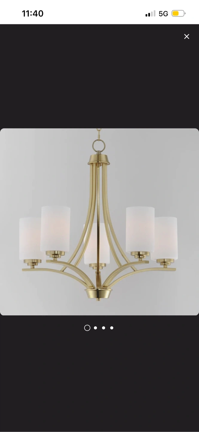 This elegant 5-light chandelier features a warm brass finish and frosted glass shades. It's perfect for adding a touch of style to any dining room or entryway. The fixture comes with a chain for adjustable hanging height.