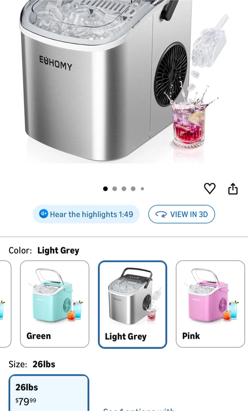 This EUHOMY ice maker creates ice in just 6 minutes. It's compact and comes with an ice scoop and a 1.3lbs ice basket. The dimensions are 8.74 x 11.57 x 11.42 inches.
