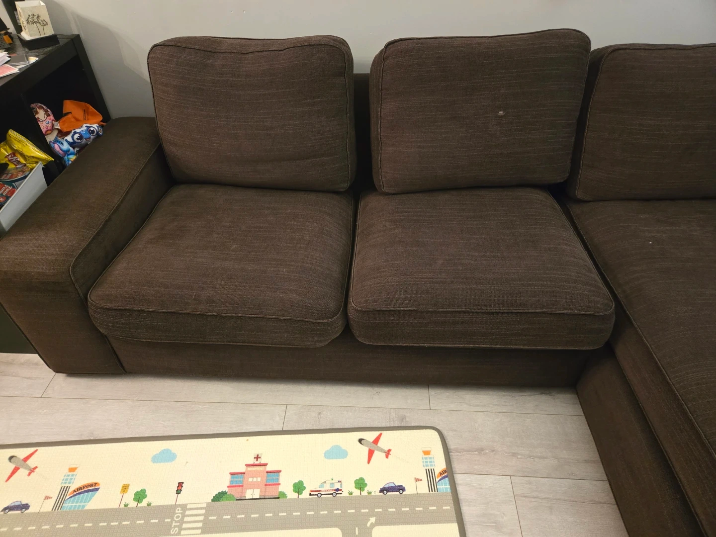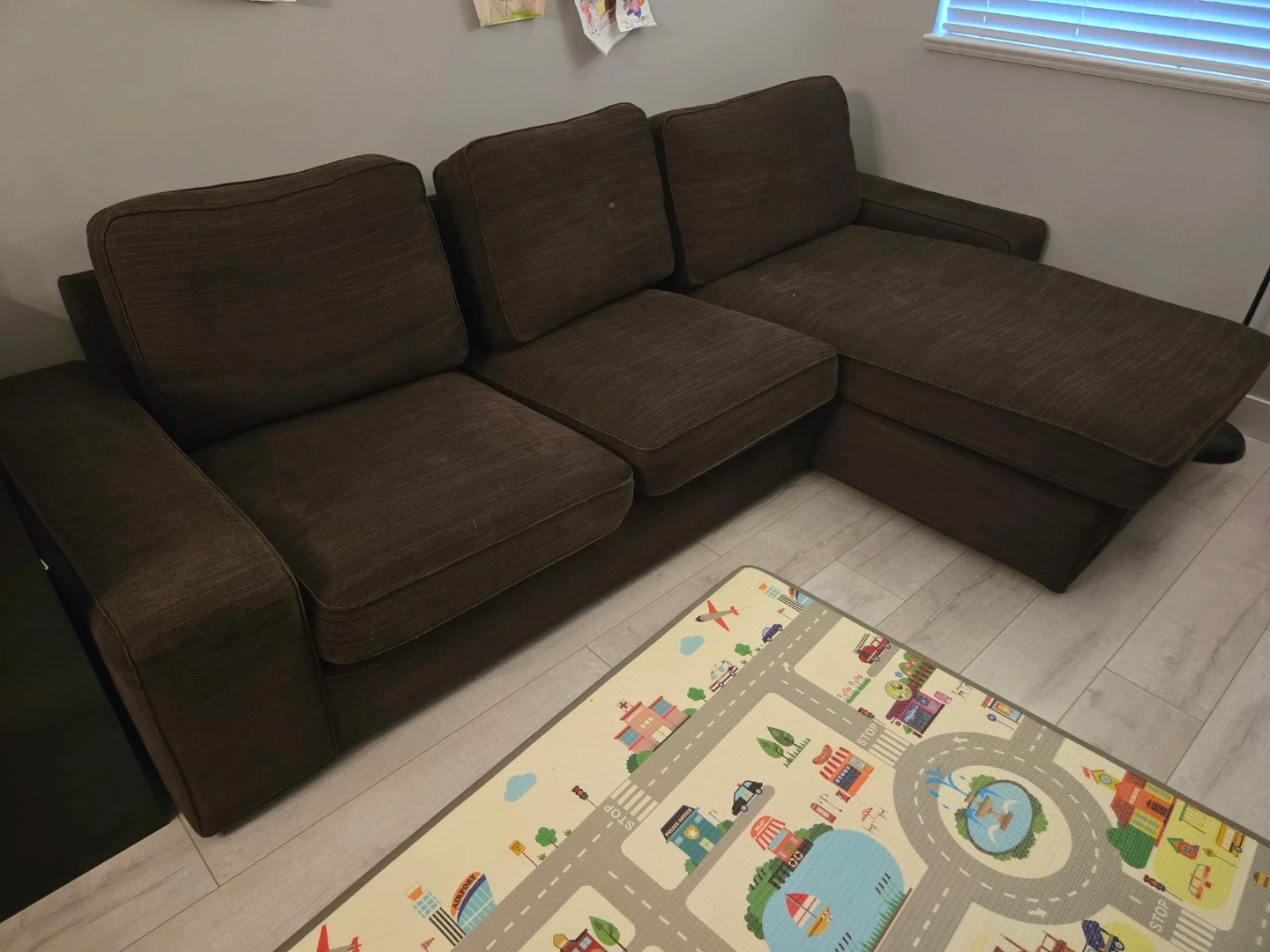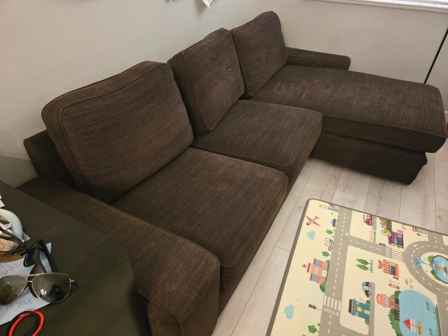 This is a comfortable brown sectional sofa with a chaise lounge. The fabric has a textured weave. It's perfect for a living room or den.