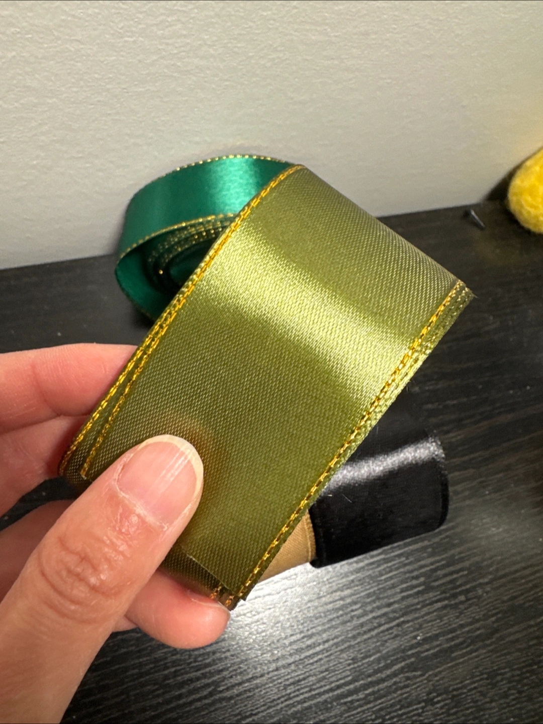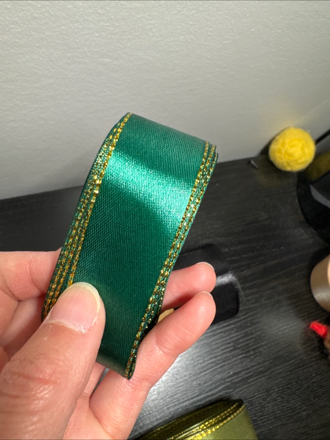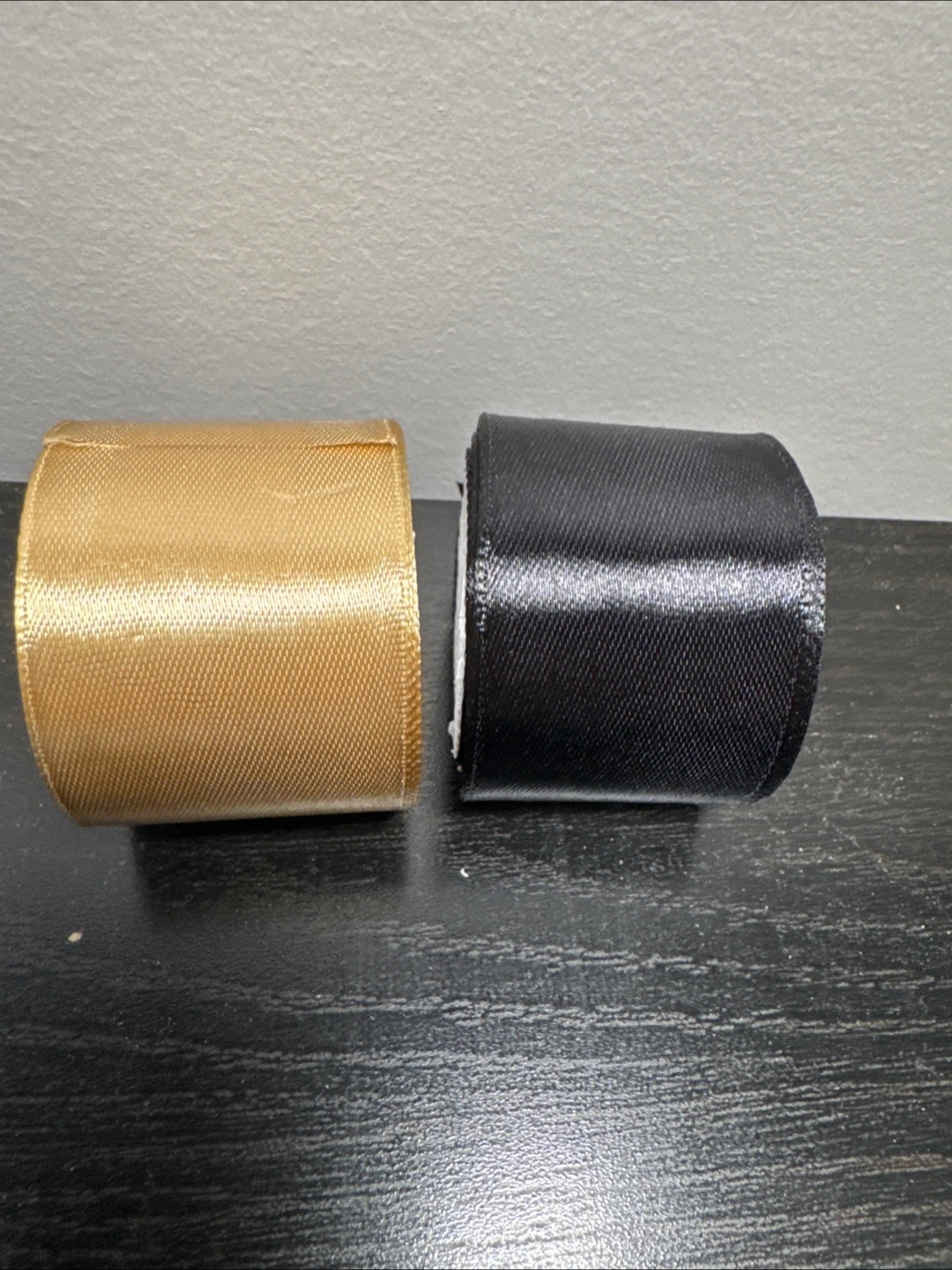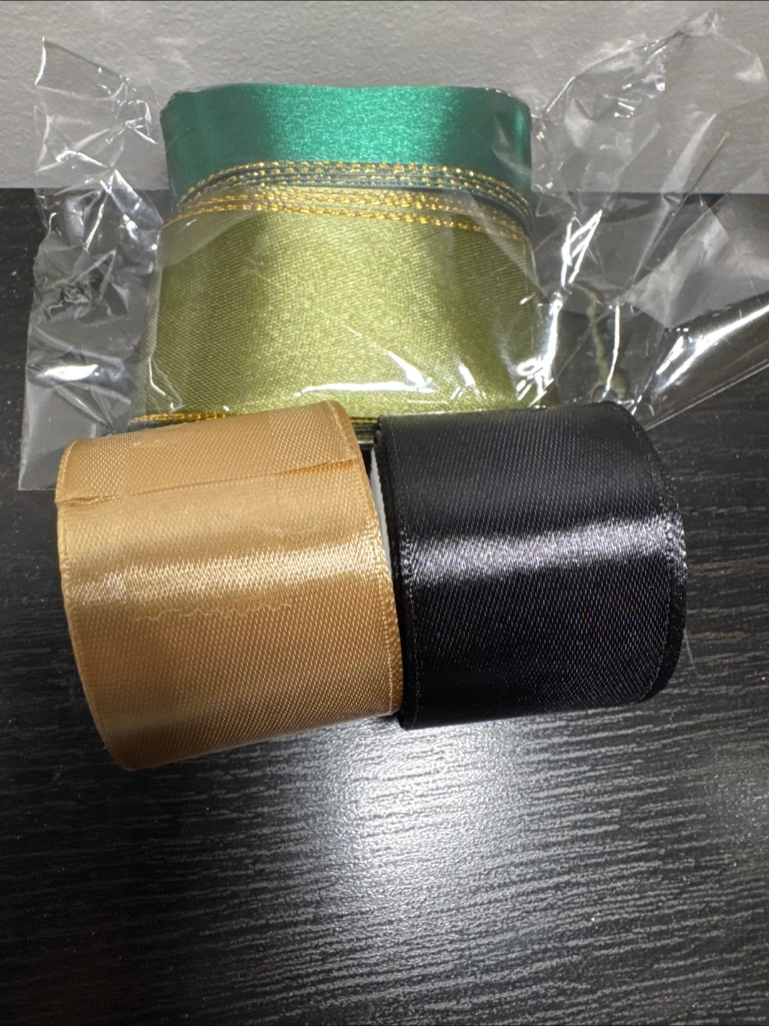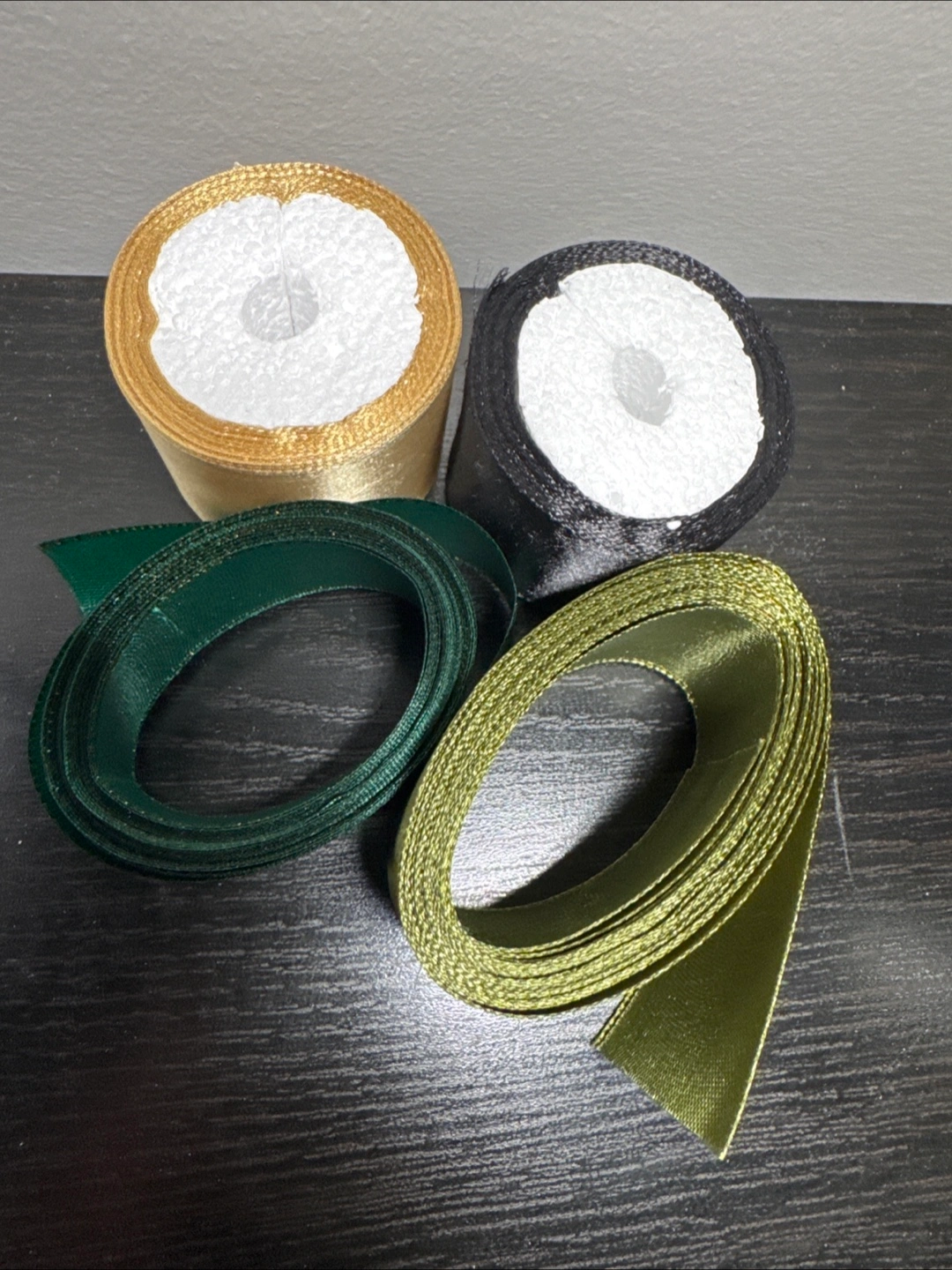 83Selling a collection of ribbon rolls in assorted colours. Includes gold, black, and green. Great for crafts or gift wrapping!