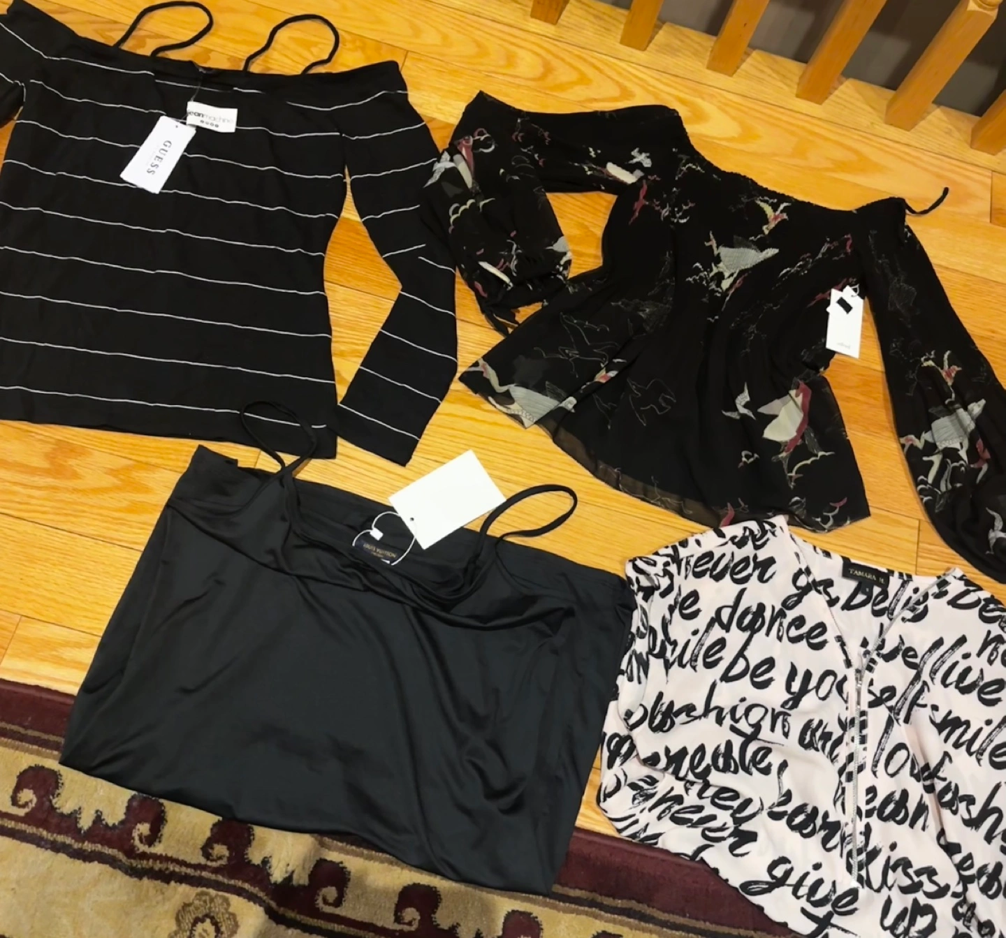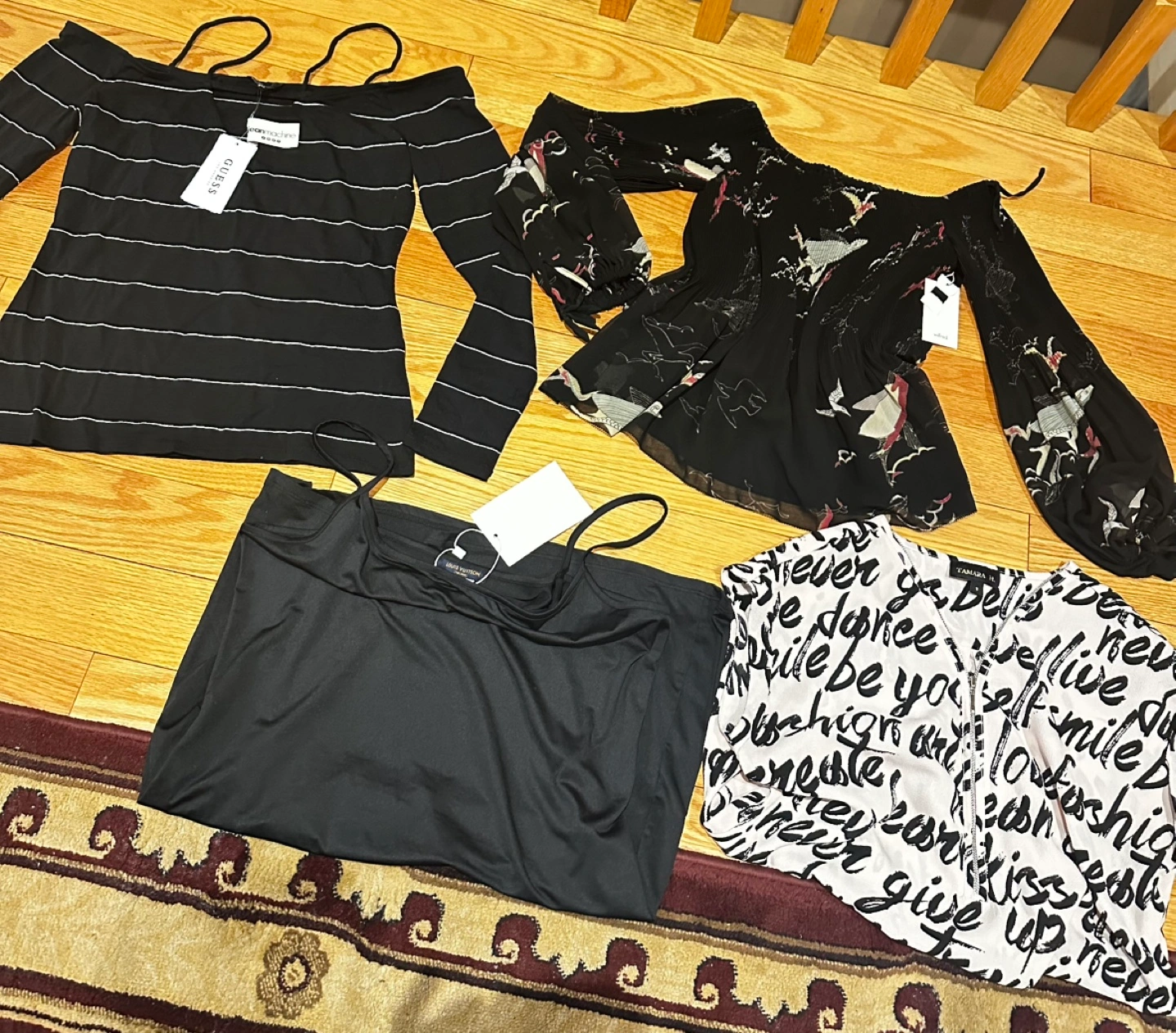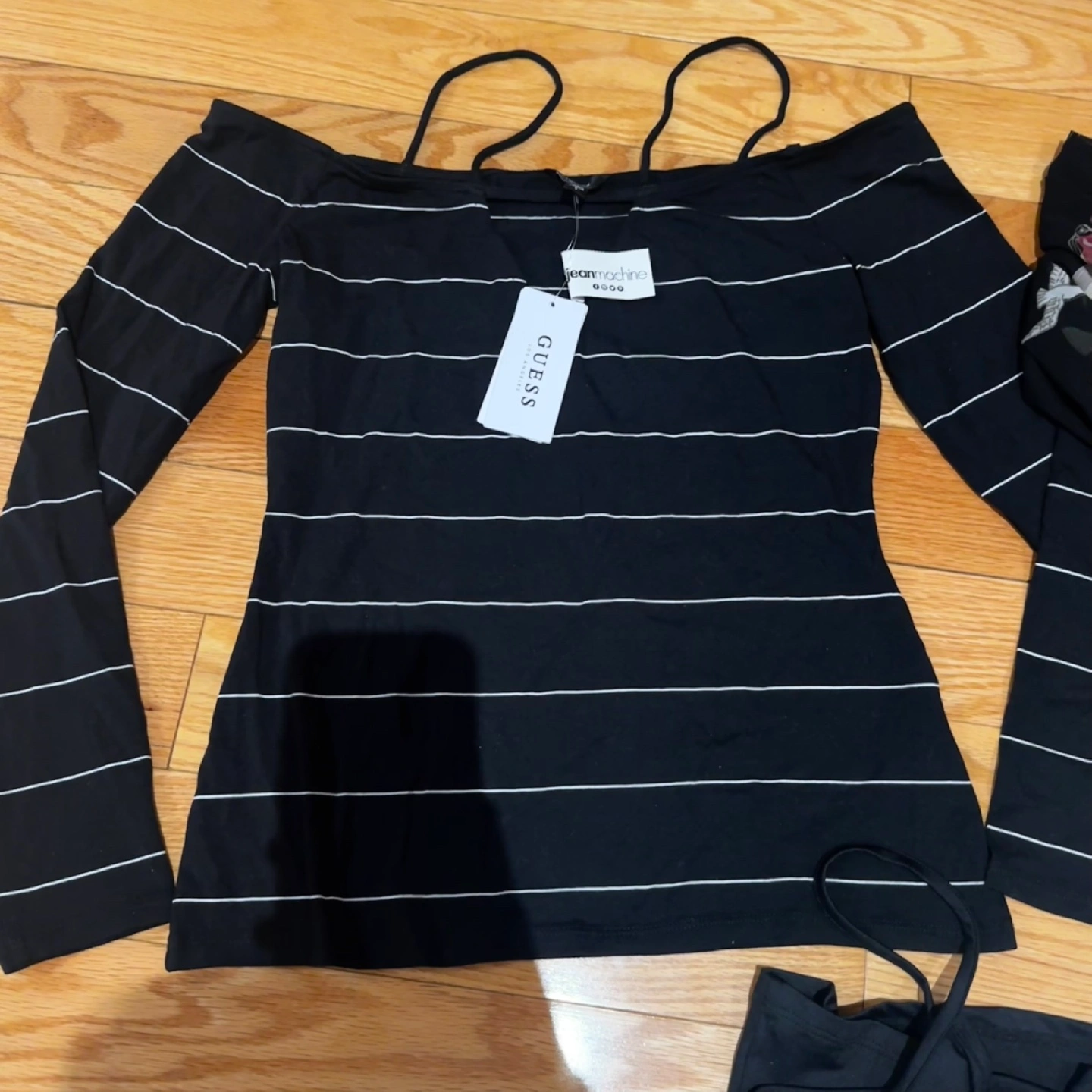 399Guess off shoulder pinstripe black long sleeve top - size: small - new, never worn with tags - super cute and very soft - P2P: 16” - shoulder to hem: 21” Black and pale pink word print blouse sleeveless - size: small - P2P: 19” - length of shoulder to hem: 26” - brand new condition, never worn - beautiful and light, perfect for spring into summer! Aritzia Wilfred Talence Off Shoulder Blouse in foulard Black and pattern - size: XS - P2P: 15-20” - shoulder to hem: 20” - new condition, has tags - silk ties on arms and shoulder - inside is lined, so it is not see through - so beautiful and unique, something that will never go out of style Louis Vuitton uniforms slip dress - size: medium - P2P: 17” - bust to hem length: 27” - brand new with tags, never worn - has a satin feel to it, really sexy on! - I haven’t had anywhere to wear it, since I got it