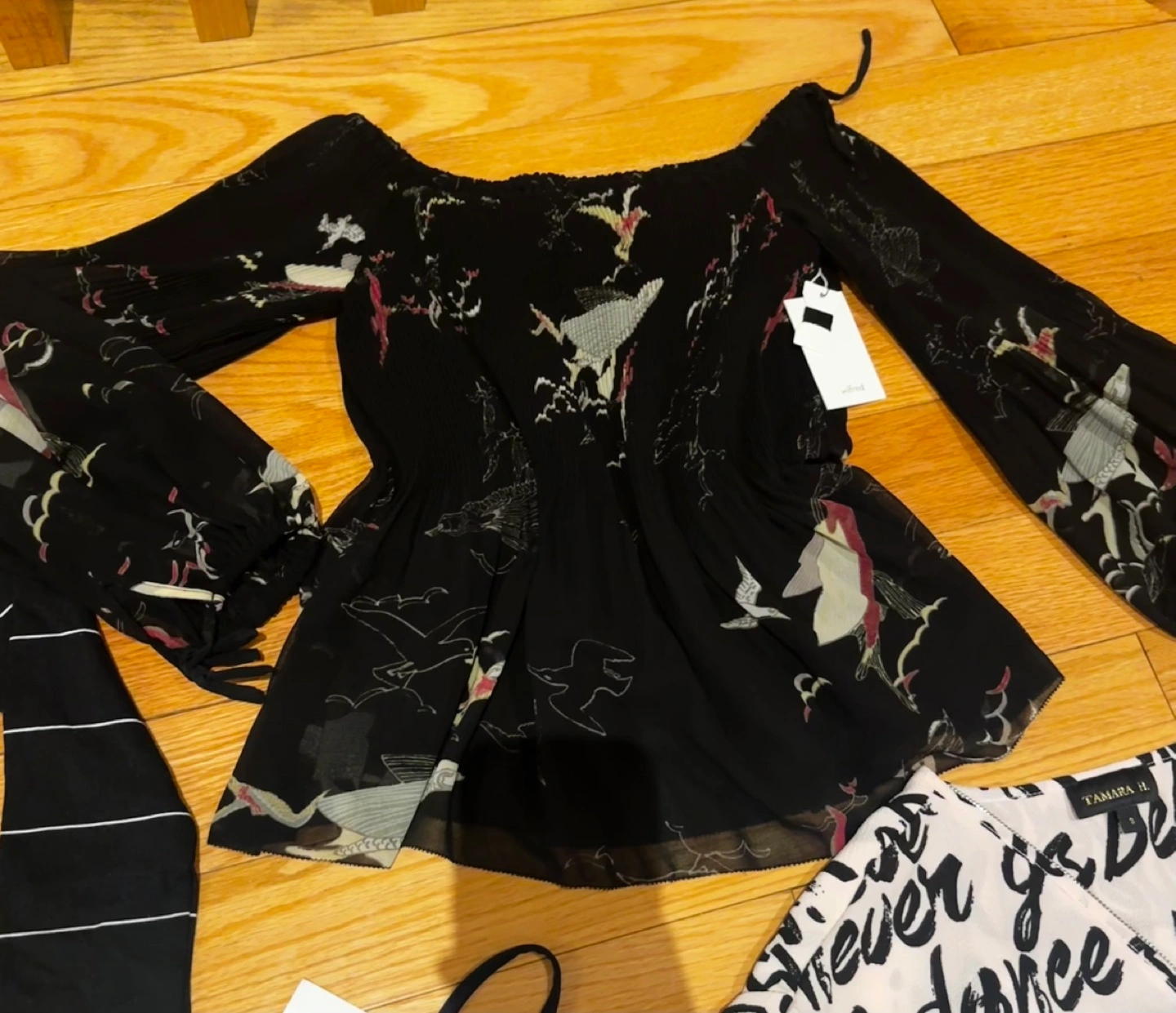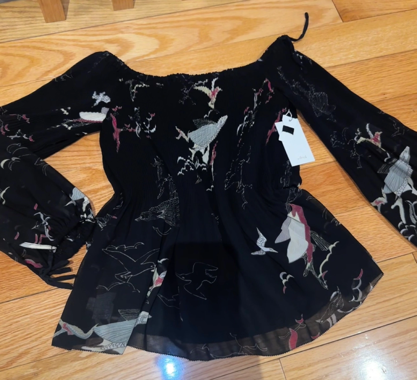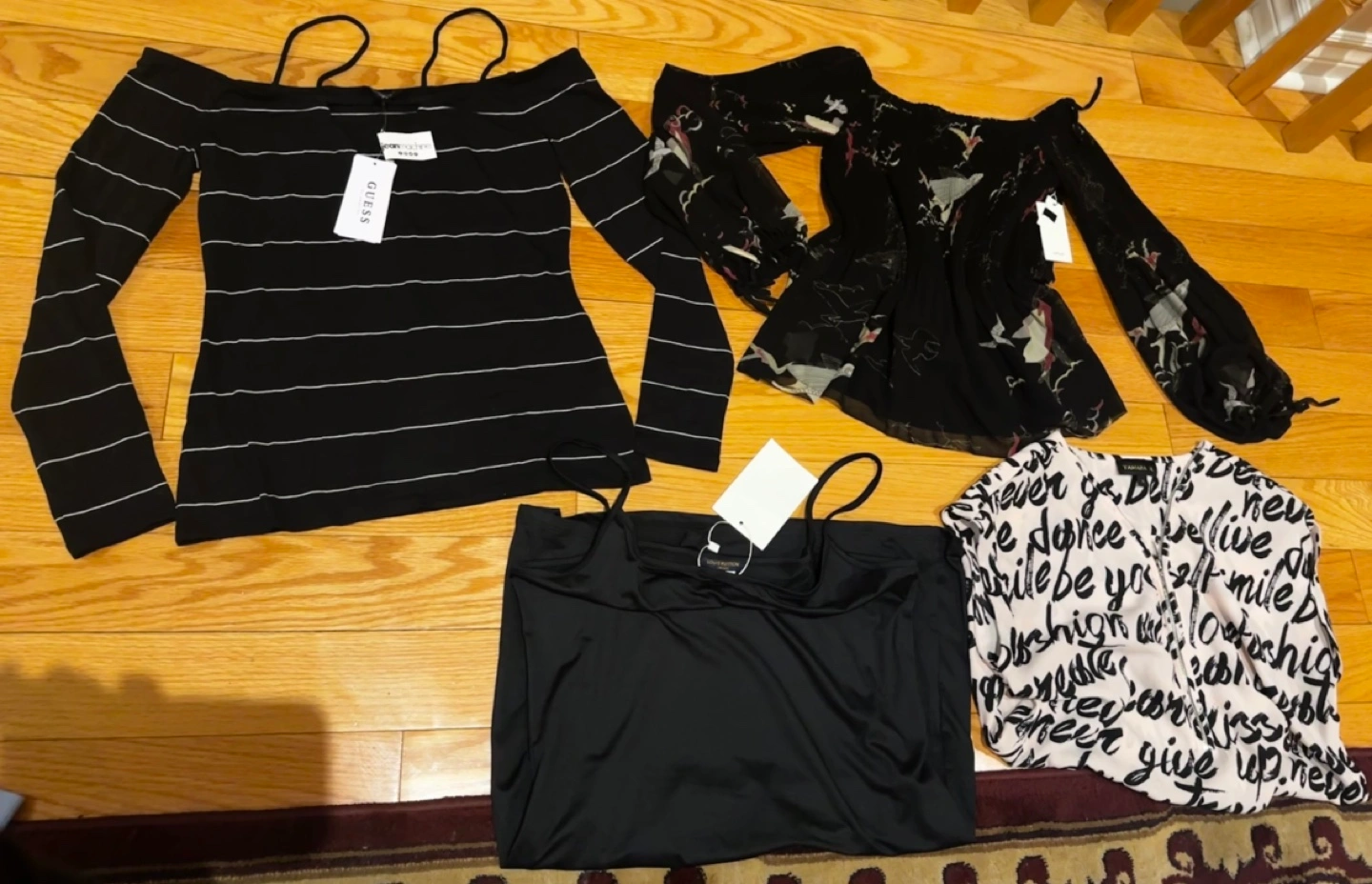 399Guess off shoulder pinstripe black long sleeve top - size: small - new, never worn with tags - super cute and very soft - P2P: 16” - shoulder to hem: 21” Black and pale pink word print blouse sleeveless - size: small - P2P: 19” - length of shoulder to hem: 26” - brand new condition, never worn - beautiful and light, perfect for spring into summer! Aritzia Wilfred Talence Off Shoulder Blouse in foulard Black and pattern - size: XS - P2P: 15-20” - shoulder to hem: 20” - new condition, has tags - silk ties on arms and shoulder - inside is lined, so it is not see through - so beautiful and unique, something that will never go out of style Louis Vuitton uniforms slip dress - size: medium - P2P: 17” - bust to hem length: 27” - brand new with tags, never worn - has a satin feel to it, really sexy on! - I haven’t had anywhere to wear it, since I got it