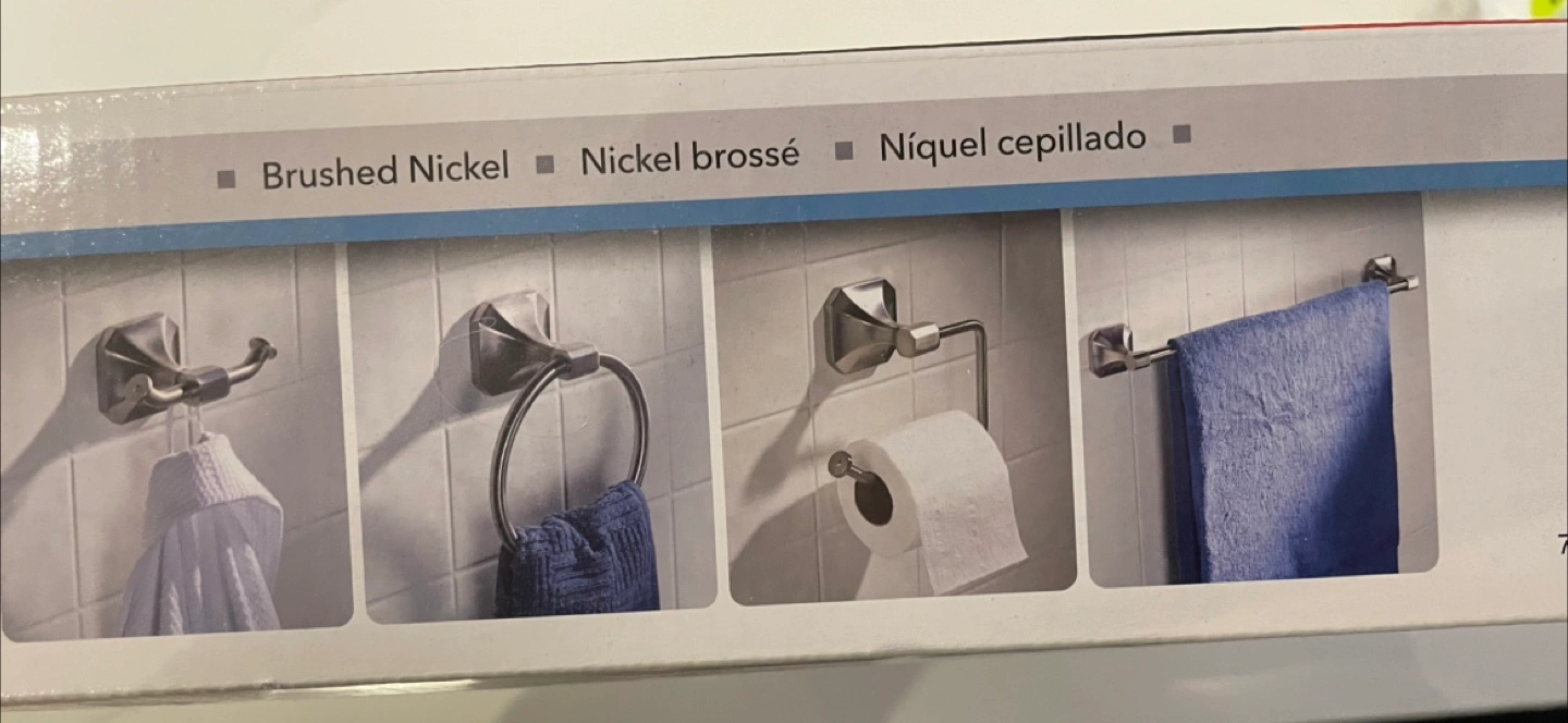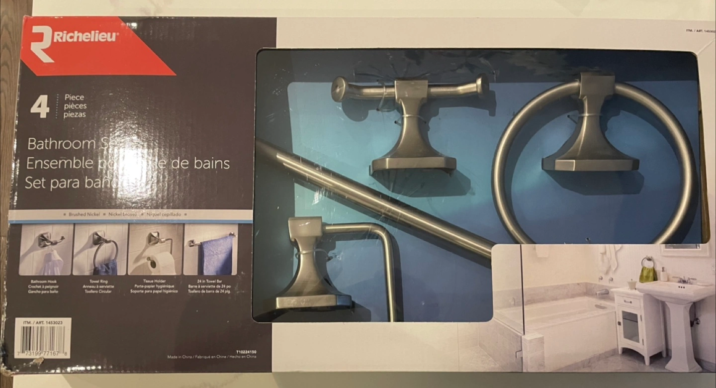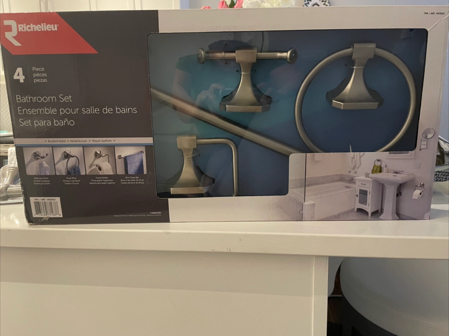 Selling a brand new Richelieu 4-piece bathroom set in brushed nickel! This set includes everything you need to outfit your bathroom with matching accessories. It includes a bathroom hook, towel ring, toilet paper holder, and a 24-inch towel bar. Get everything you need in one convenient package!