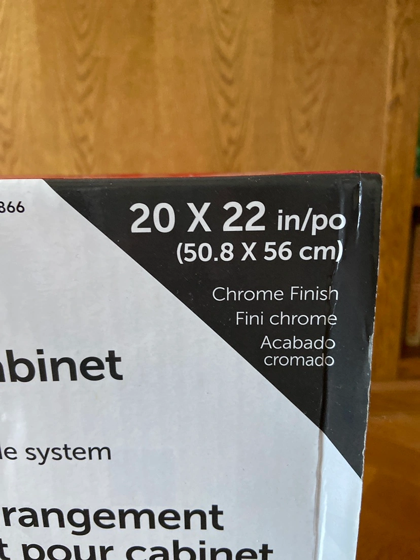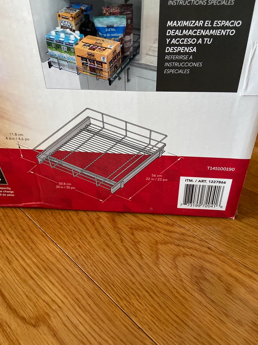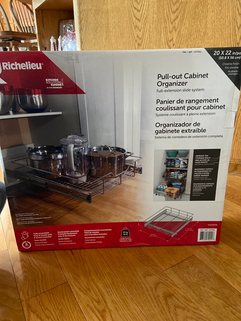 This is a pull-out cabinet organizer. It is in its original packaging. It comes with full-extension slide system. It is chrome finished and is 20" wide and 22" deep. It is a Richelieu brand item. Pick up Meadowvale and Lawrence area. Cash only.