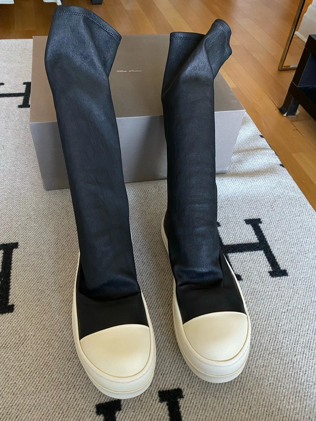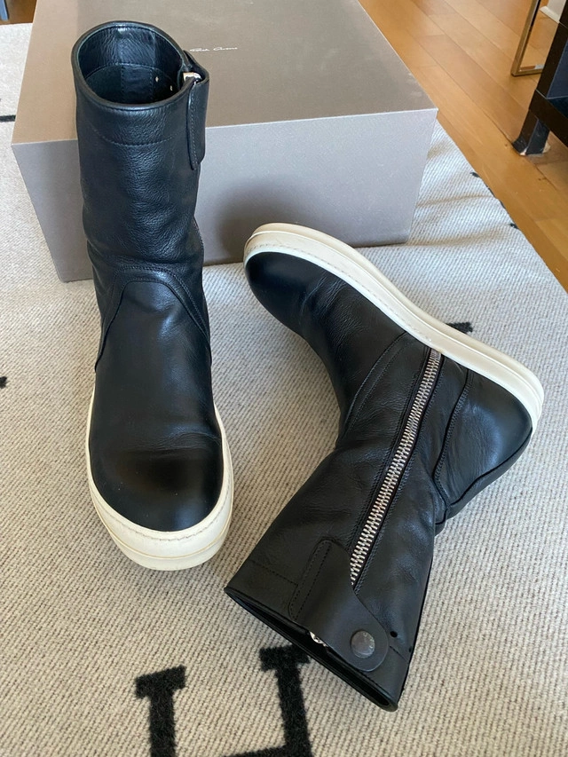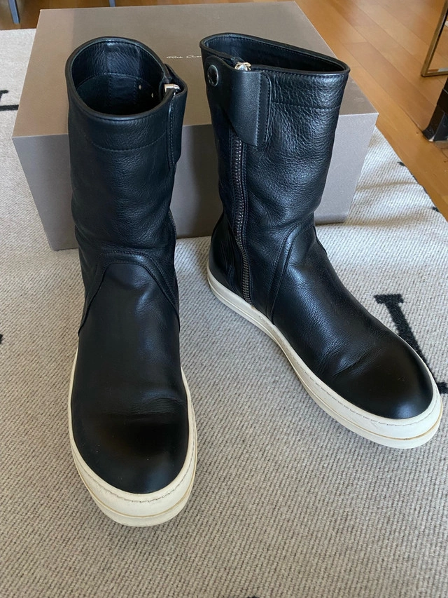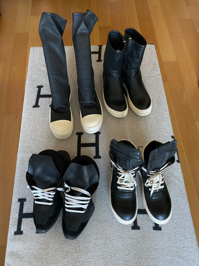 Selling a collection of Rick Owens leather boots. These boots showcase Rick Owens' signature avant-garde aesthetic with high-quality leather construction. There are 4 pairs of boots available in this collection. Made in Italy. * Sizes: All size 42 * Material: Leather * Style: Various styles, including high-tops