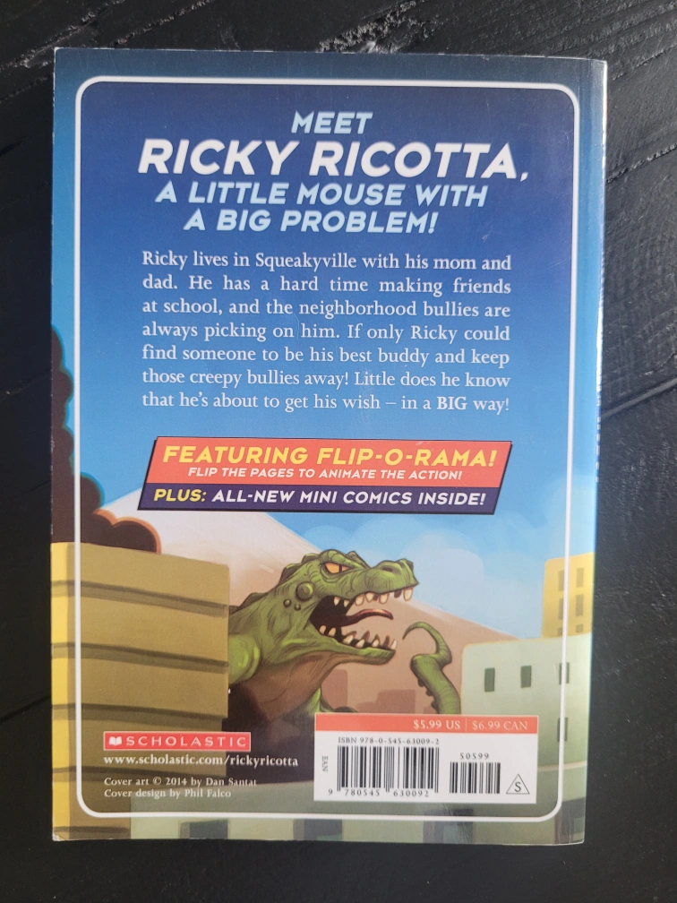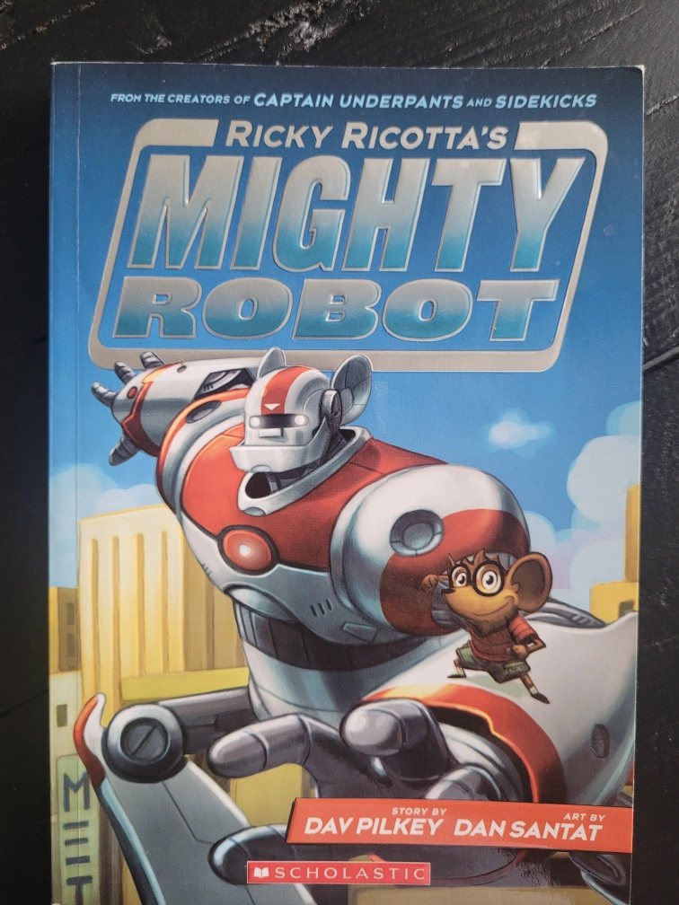 Selling Ricky Ricotta's Mighty Robot, a fun book by Dav Pilkey and Dan Santat! It's part of the Ricky Ricotta series and is a great read for kids. The book also features Flip-O-Rama!