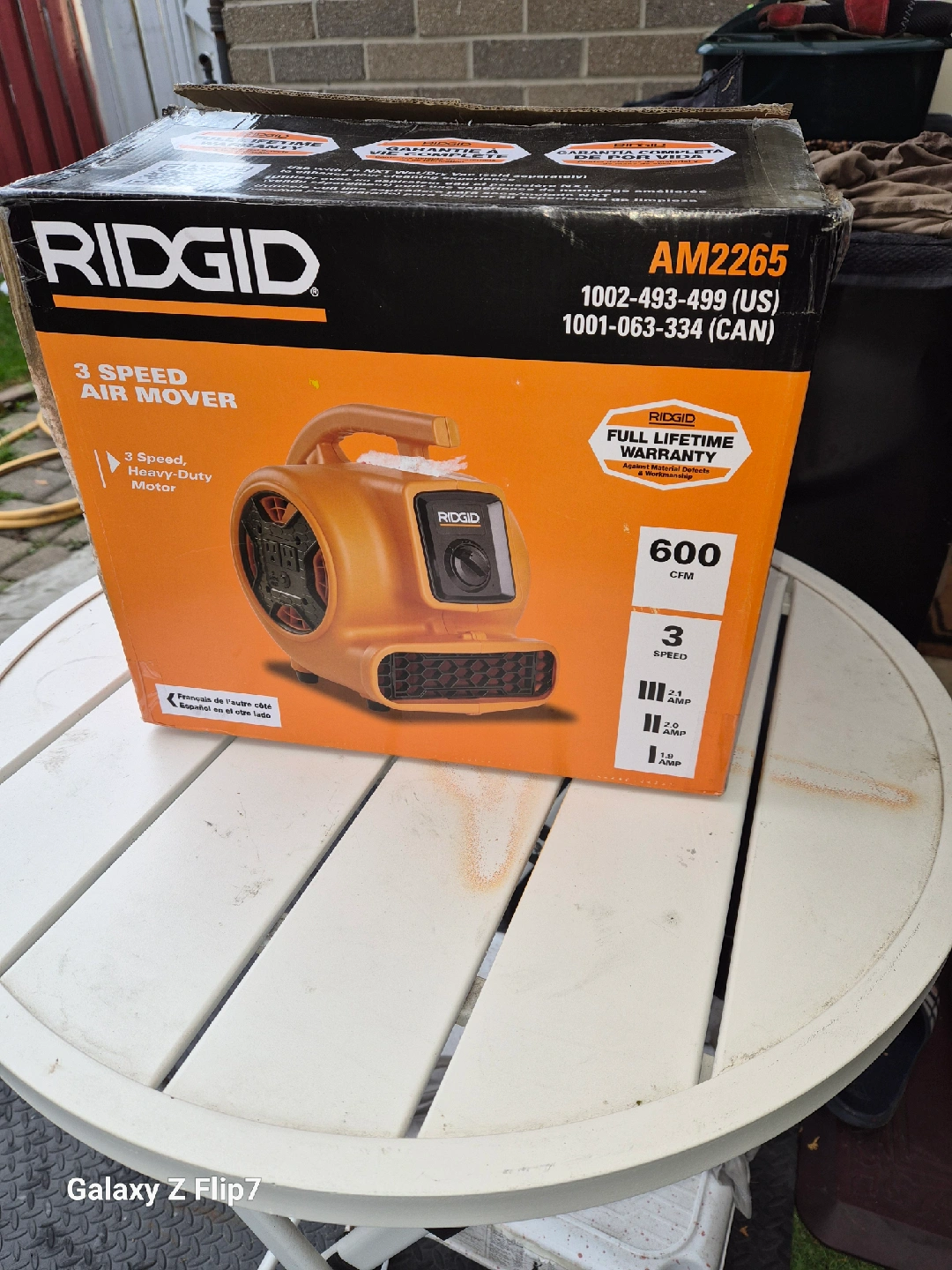 Selling a RIDGID AM2265 3-Speed Air Mover. It's in like new condition and comes with the original box! This air mover features: - 3-speed heavy-duty motor - 600 CFM - Full lifetime warranty Great for quick drying after spills or for improving ventilation