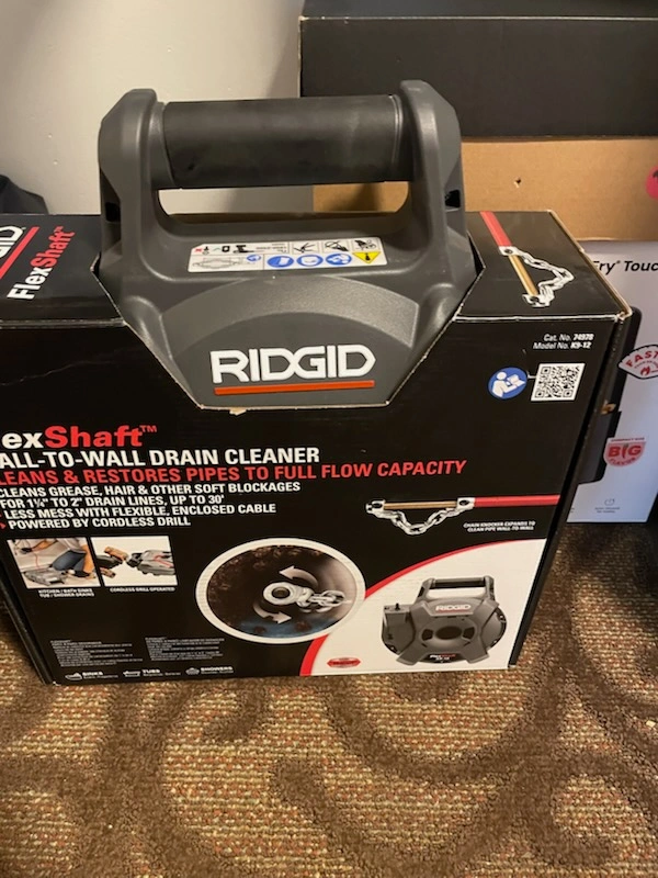 Selling a RIDGID FlexShaft All-To-Wall Drain Cleaner, model K9-12! This drain cleaner is designed to clean grease, hair, and other soft blockages in 1 1/4" to 2" drain lines, up to 30 feet. It features a flexible, enclosed cable for less mess and is powered by a cordless drill. Get your pipes flowing freely again!