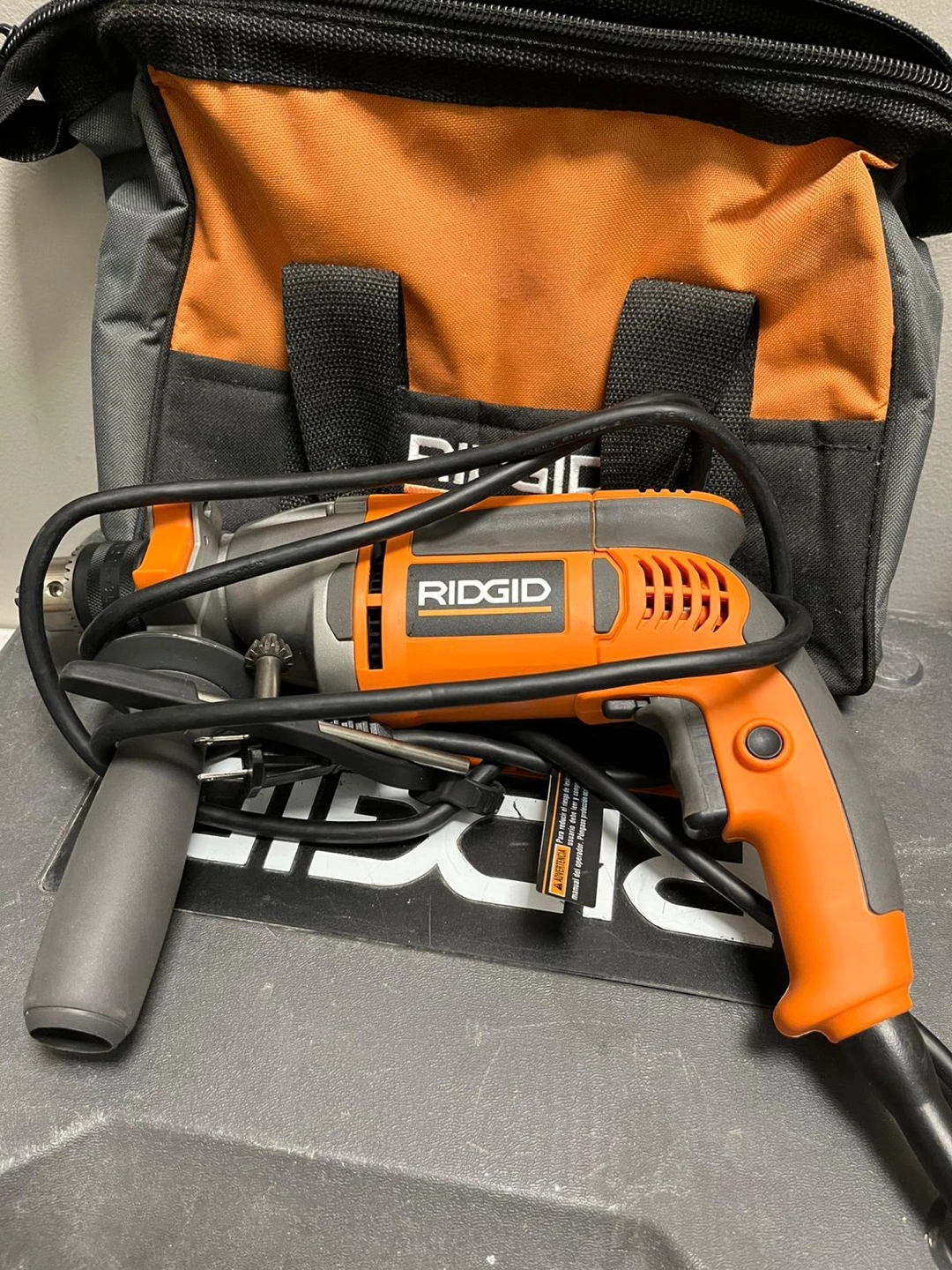 A power drill with an orange and grey design. A black case with an orange section to store the drill. You can use this tool to assemble furniture.