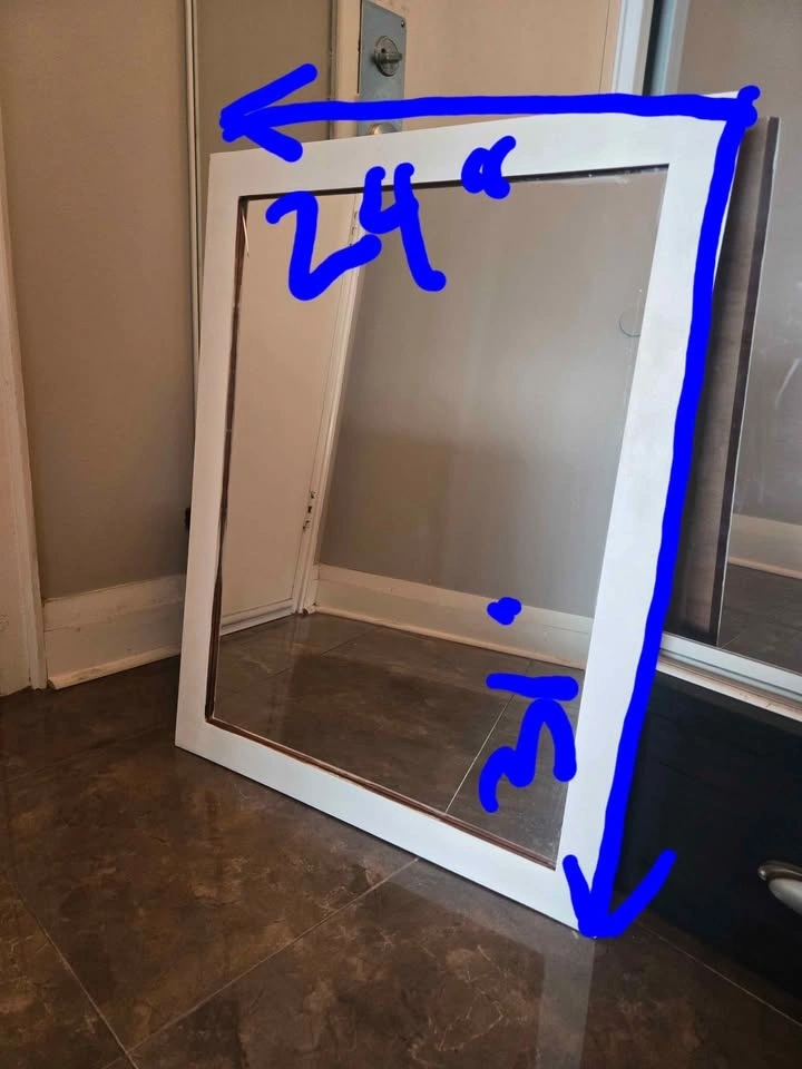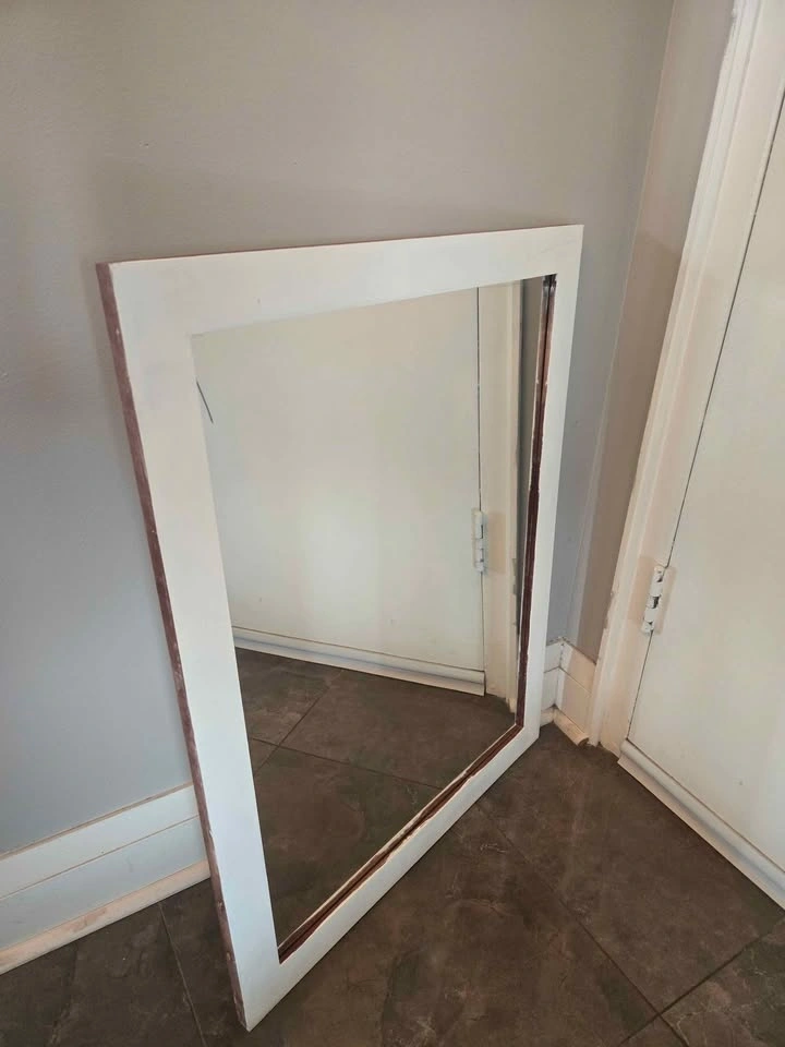 1) Rectangular wall mirror with white wooden frame in very good condition. Can be used vertically or horizontally. Size 31"x24". For $15 cash.