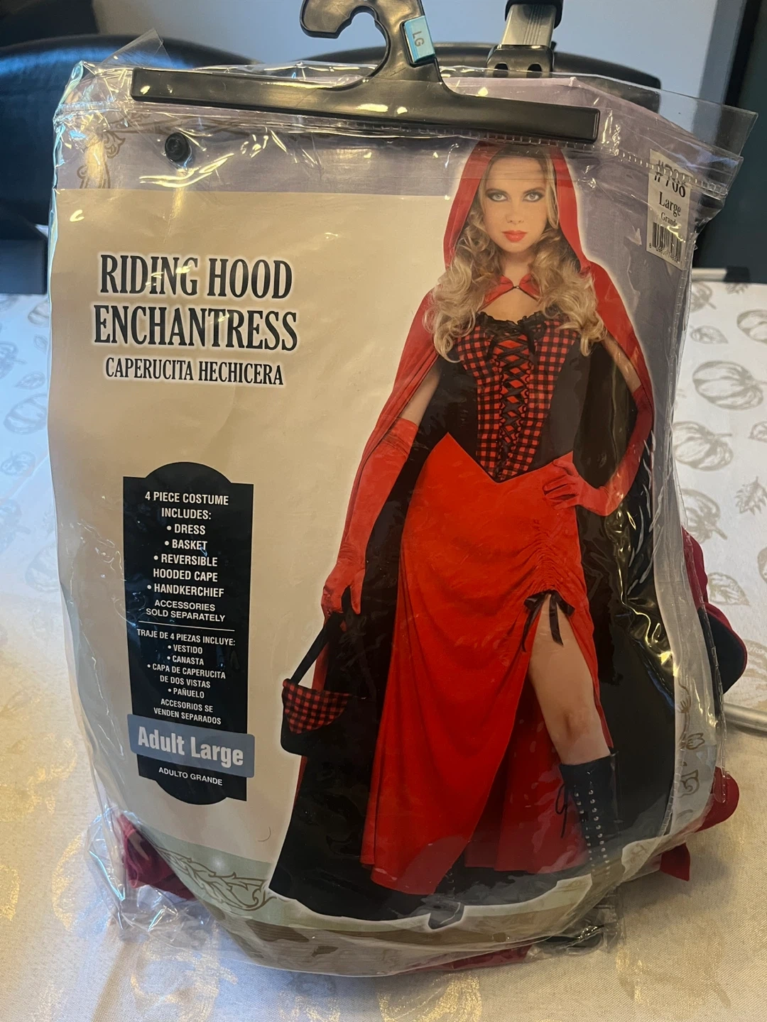 Selling a Riding Hood Enchantress costume in adult size large! This 4-piece costume includes the dress, basket, reversible hooded cape, and handkerchief. Accessories are sold separately.
