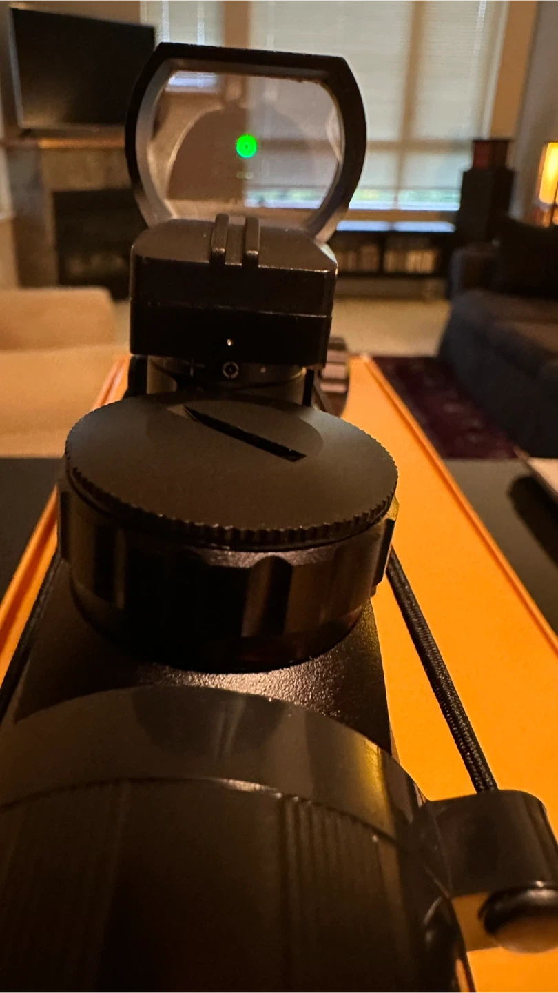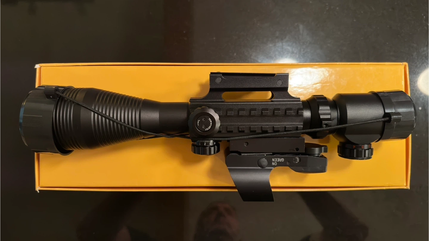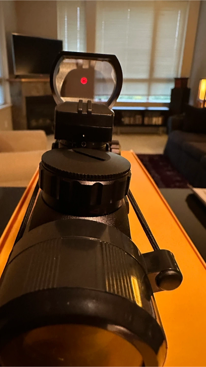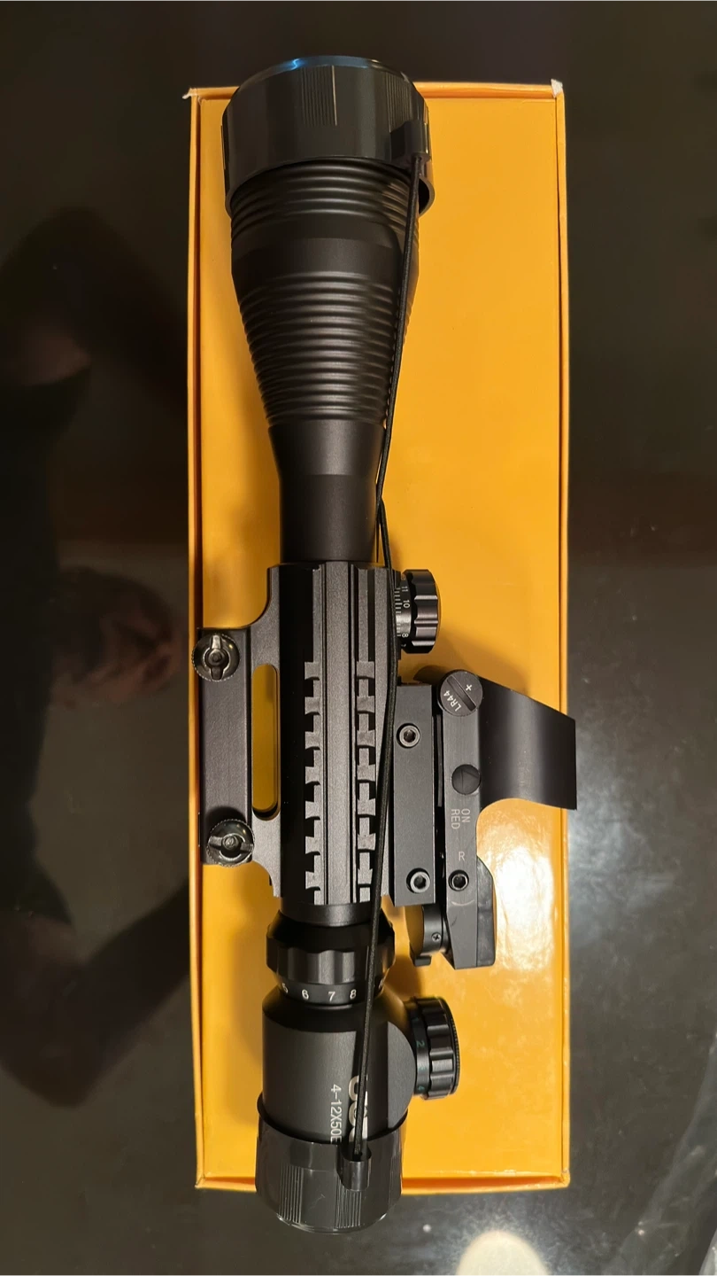 Selling a riflescope that's in great shape and comes with its original box! 12x50 magnification range Dual illuminated with laser sight and holographic dot reflex sight