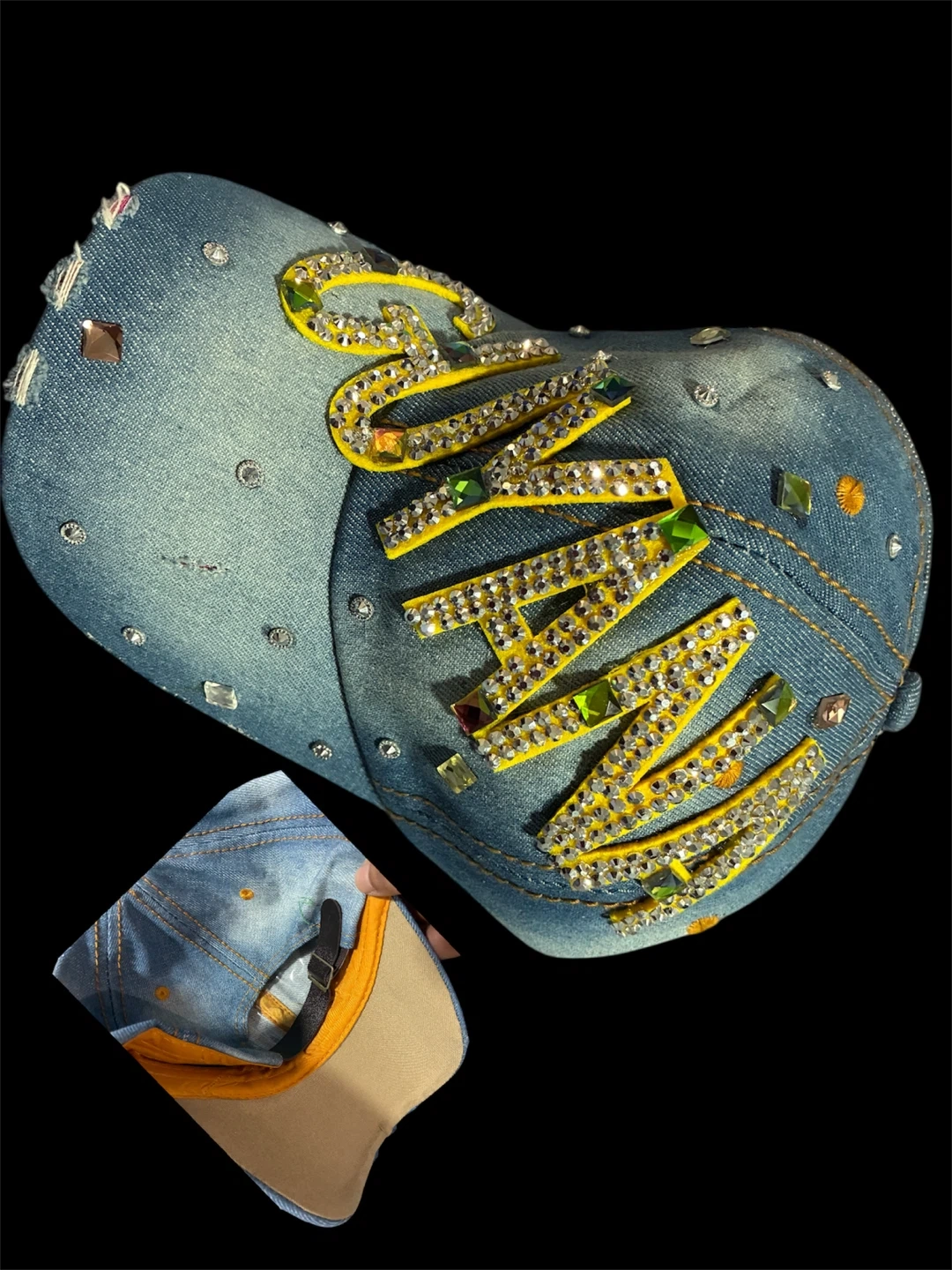 This stylish baseball cap is made from denim and features bright yellow lettering embellished with rhinestones and colourful gems. It has an adjustable strap at the back for a comfortable fit. It's a great accessory for adding some sparkle to your outfit!