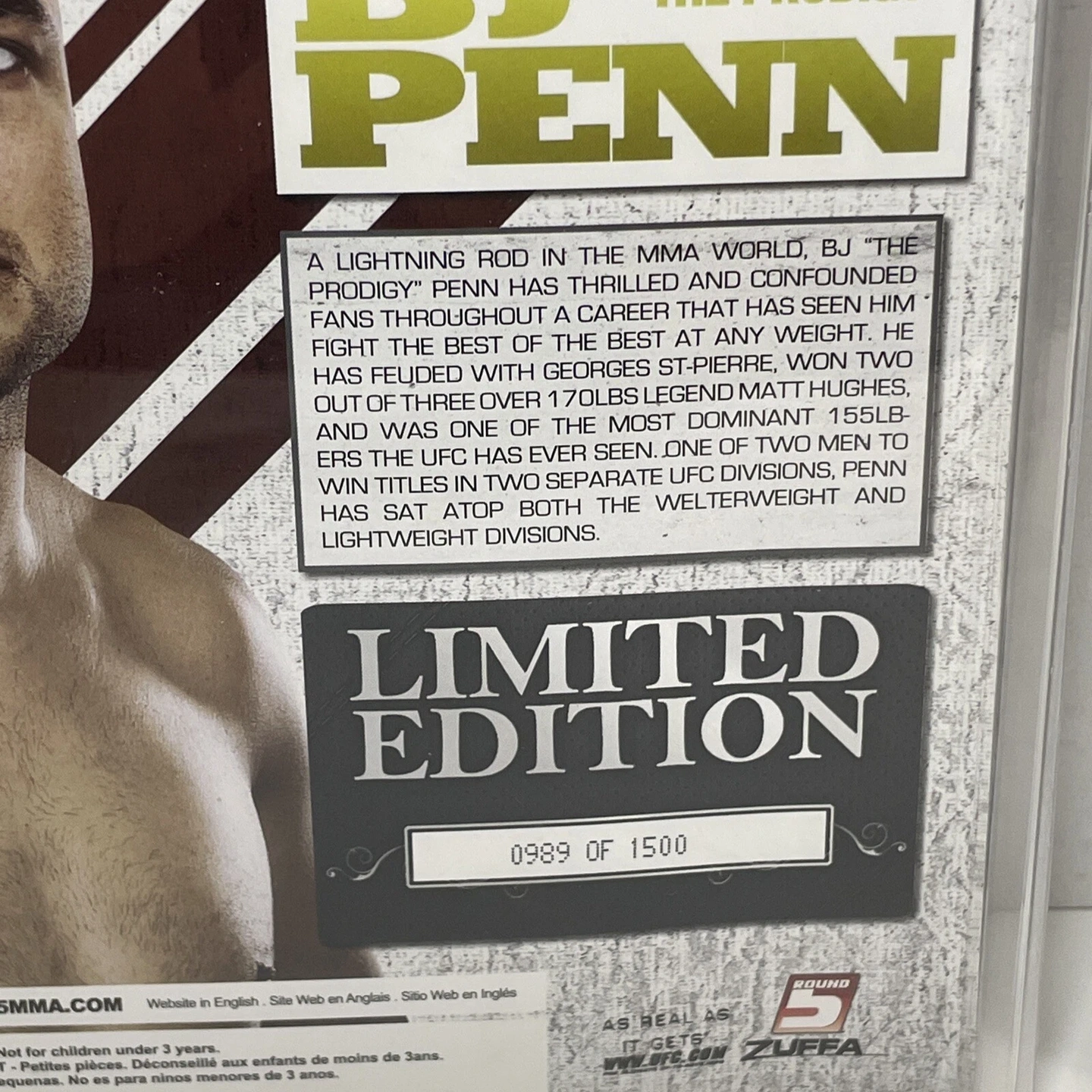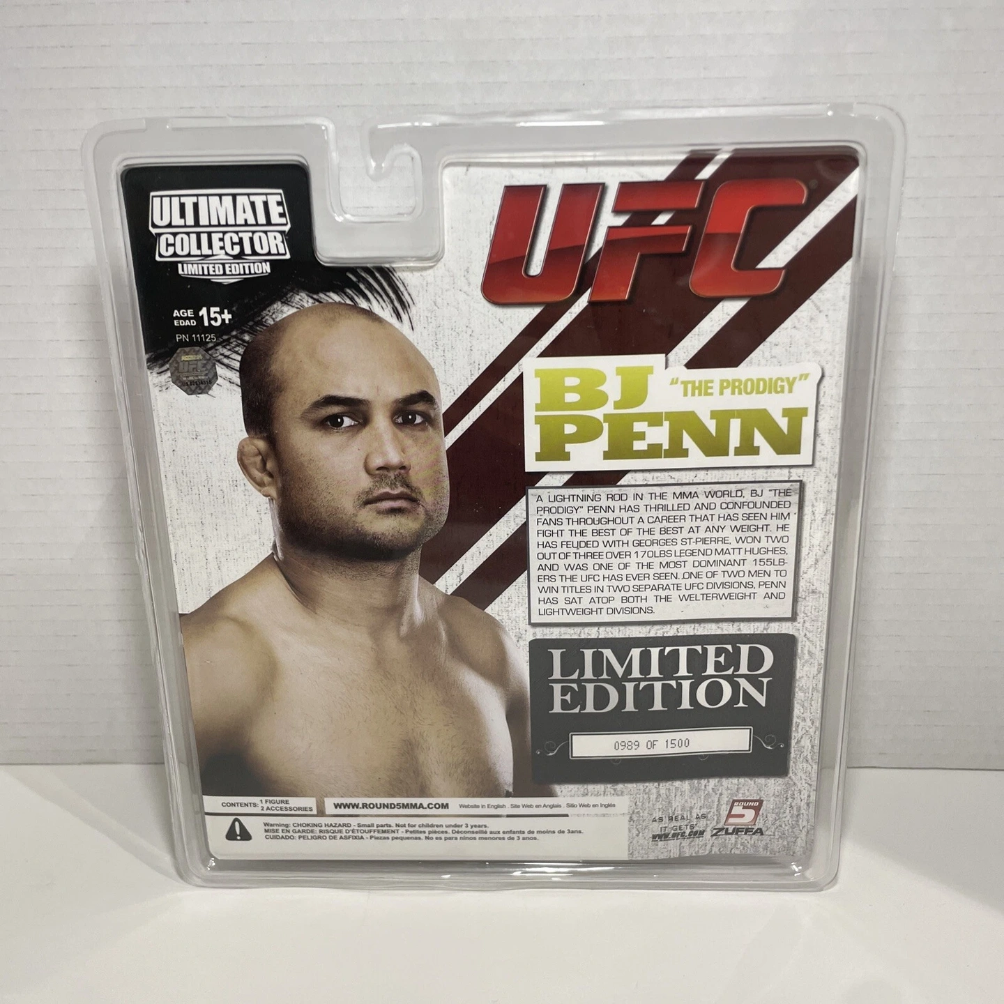 Round 5 Collectors UFC Ultimate Collector Series 2 Limited Edition Action Figure featuring BJ "The Prodigy" Penn. This is an original, unopened item from China, number 989 out of 1500. Includes belt. Suitable for ages 5+.