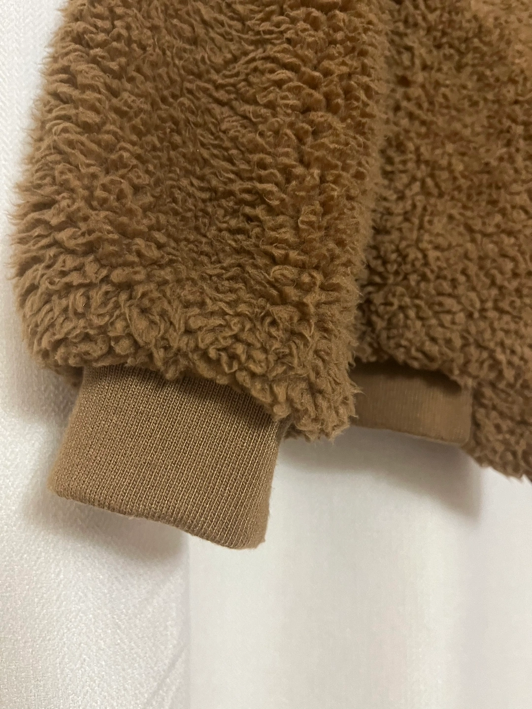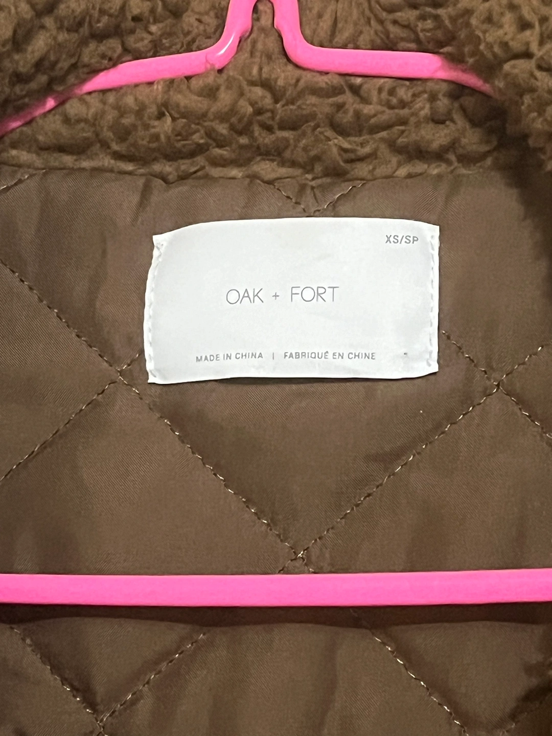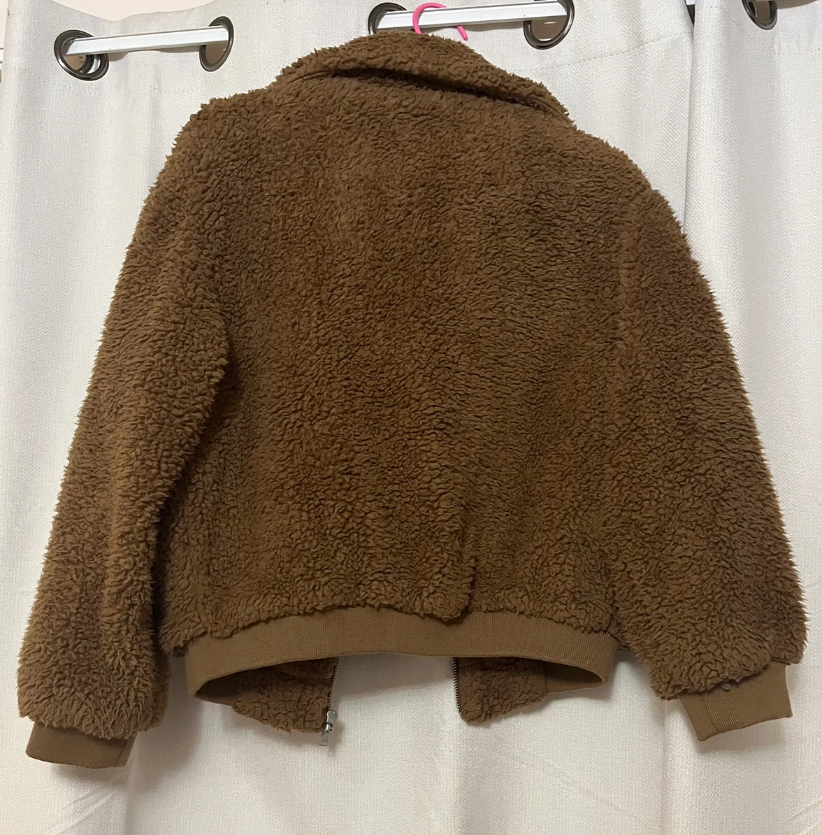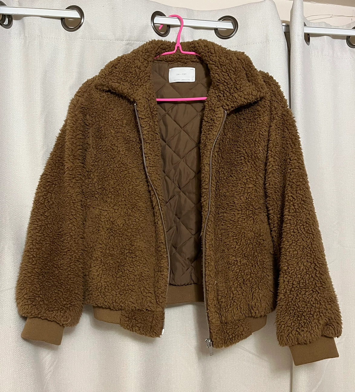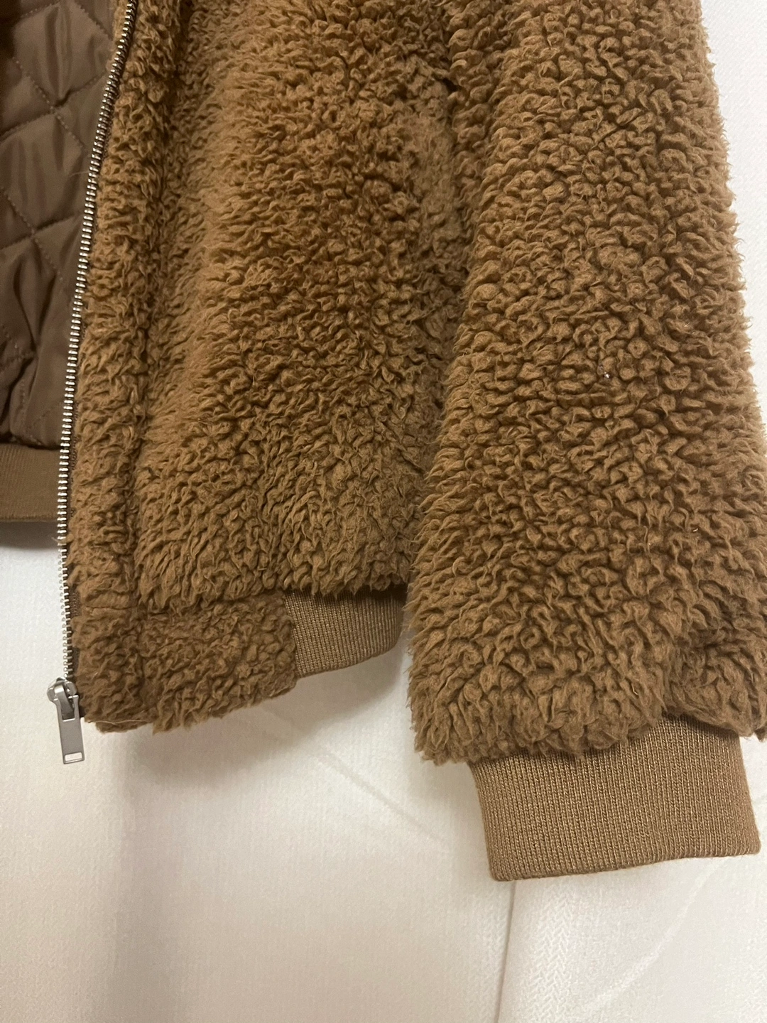 A brown teddy bear jacket with a zipper closure and a quilted lining.